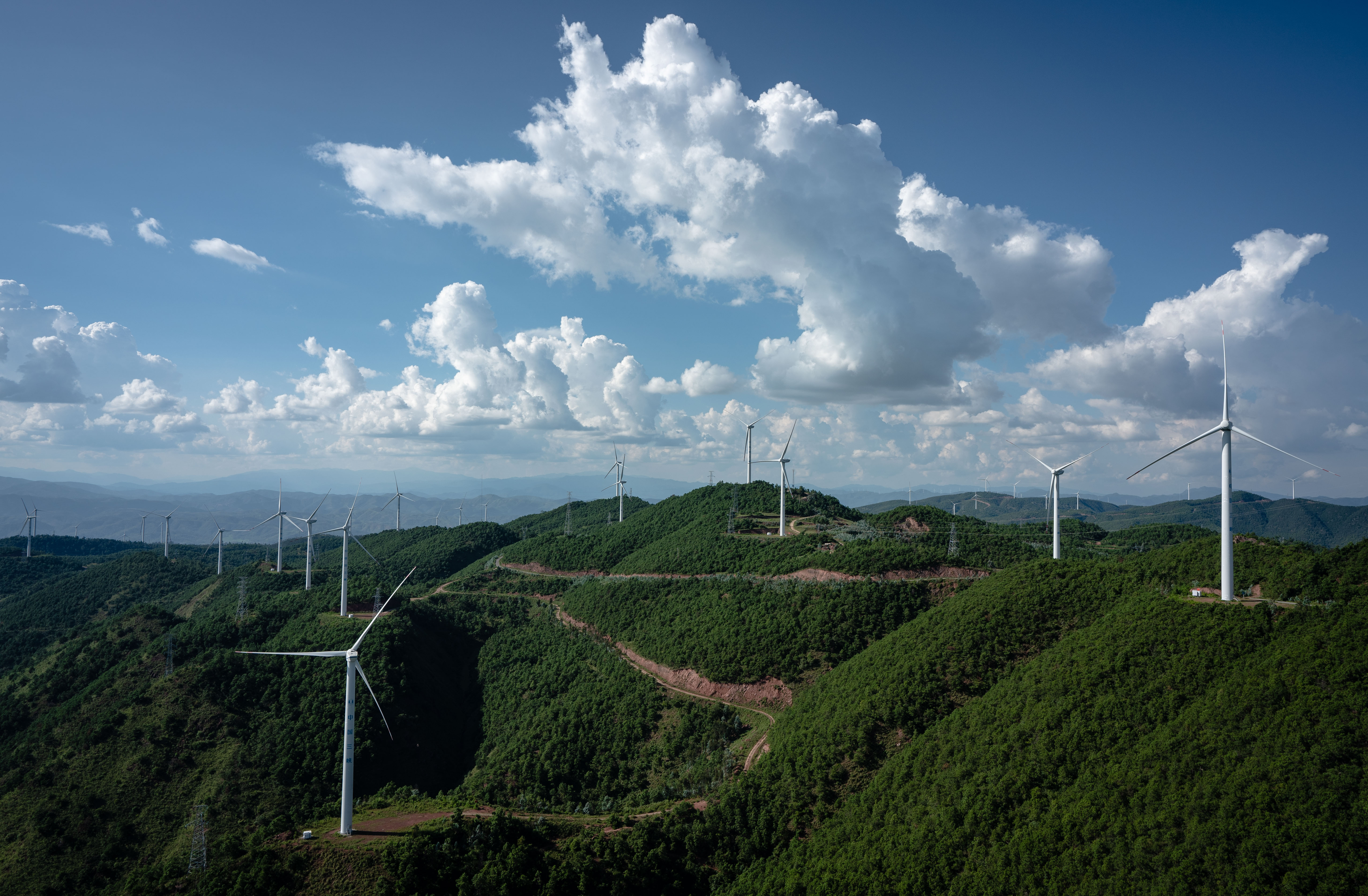 這是2022年8月18日在云南省楚雄彝族自治州姚安縣內(nèi)拍攝的風(fēng)力發(fā)電機(jī)。新華社記者 王冠森 攝