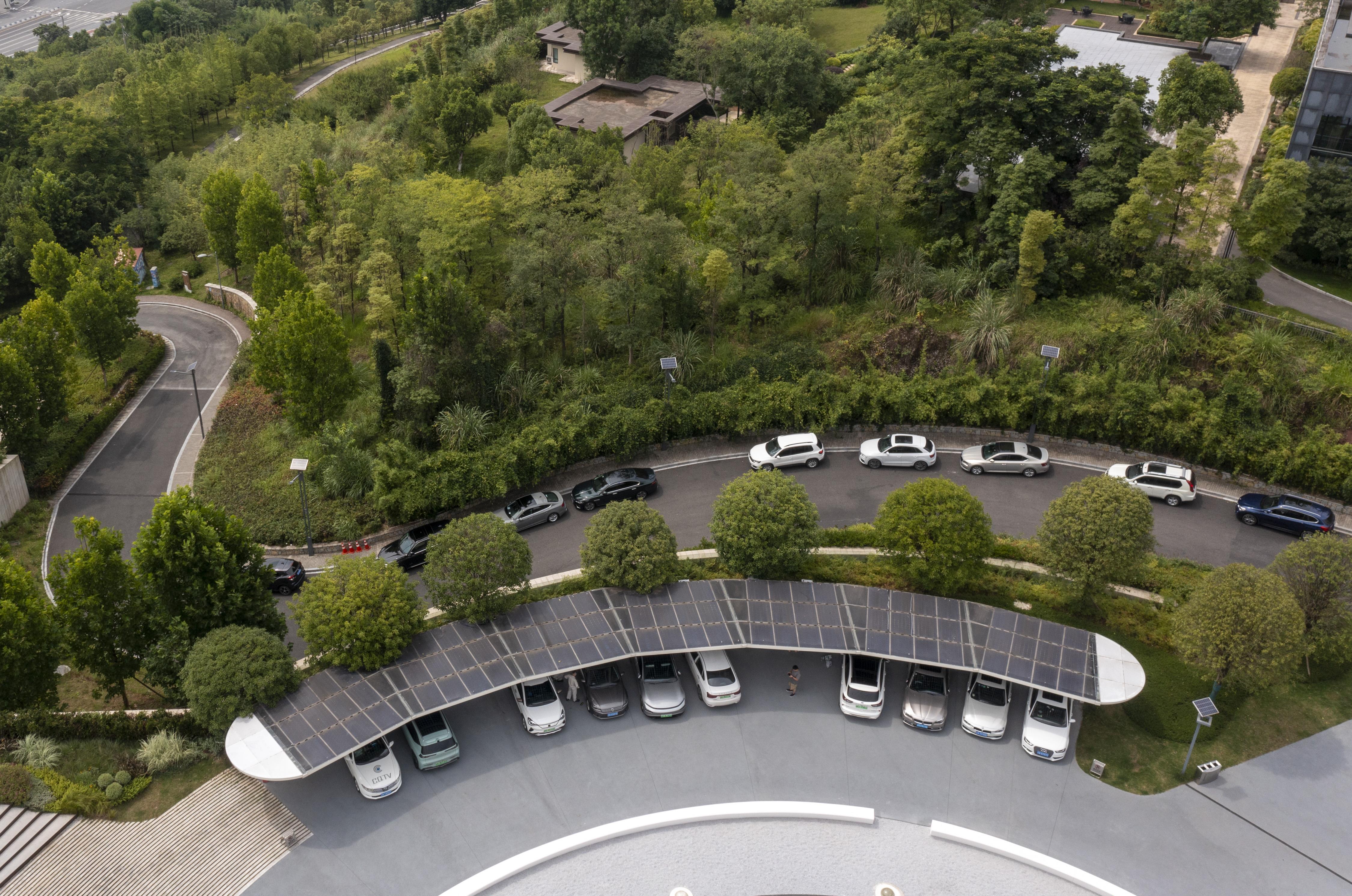 2022年6月16日拍攝的已建成投用的重慶首座光伏充電發(fā)用一體充電站(無人機(jī)照片)。新華社記者 劉潺 攝