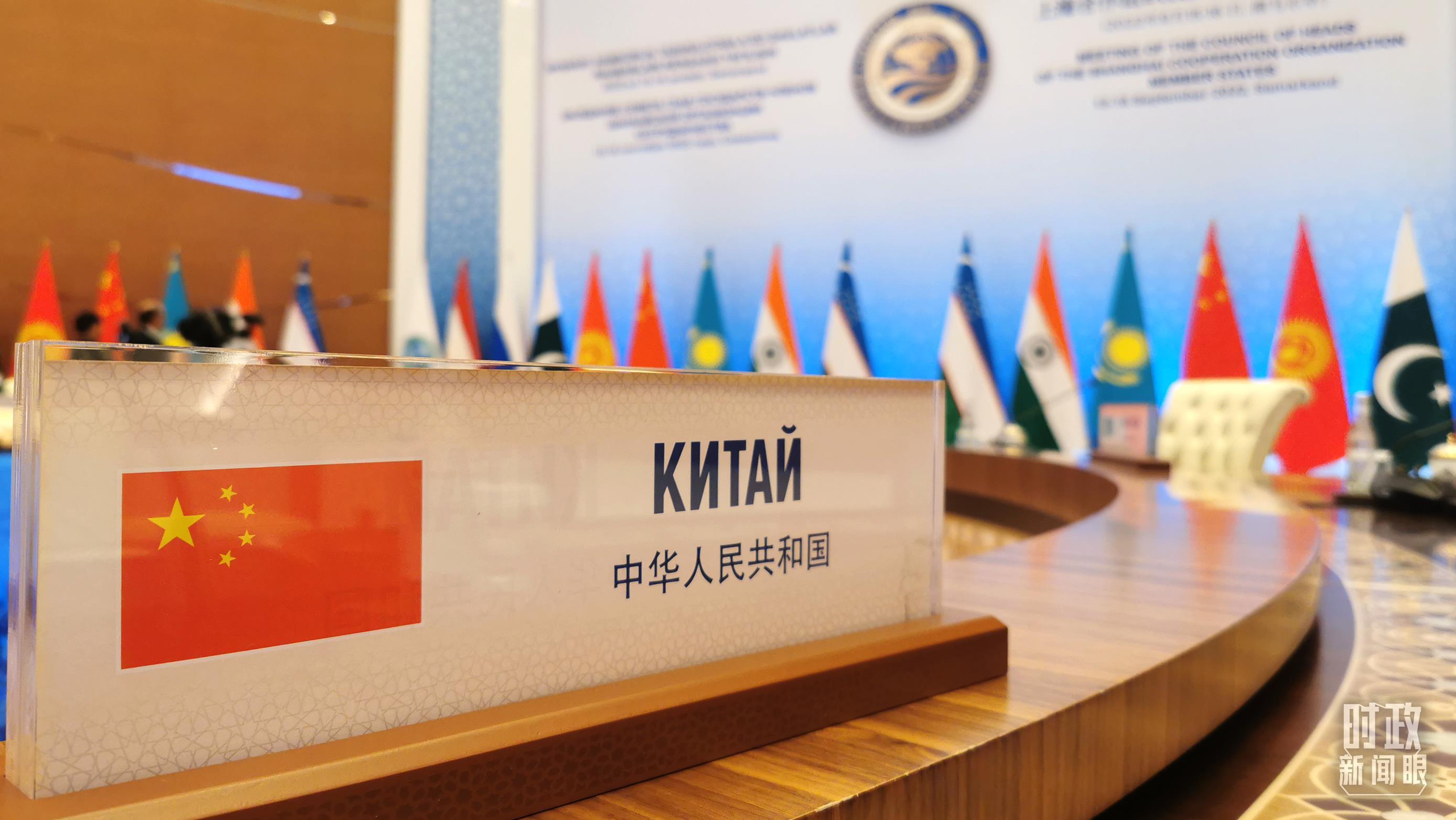△2022年9月16日,習(xí)近平赴烏茲別克斯坦撒馬爾罕出席上合峰會。這是小范圍會談現(xiàn)場的中方桌簽。(總臺央視記者黃京輝拍攝)