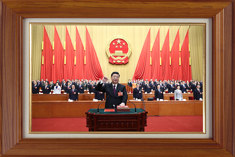 這張照片,是2018年3月17日,習近平當選國家主席、中央軍委主席后進行憲法宣誓的場景。自發(fā)表2019年新年賀詞起,就一直擺在書架上。