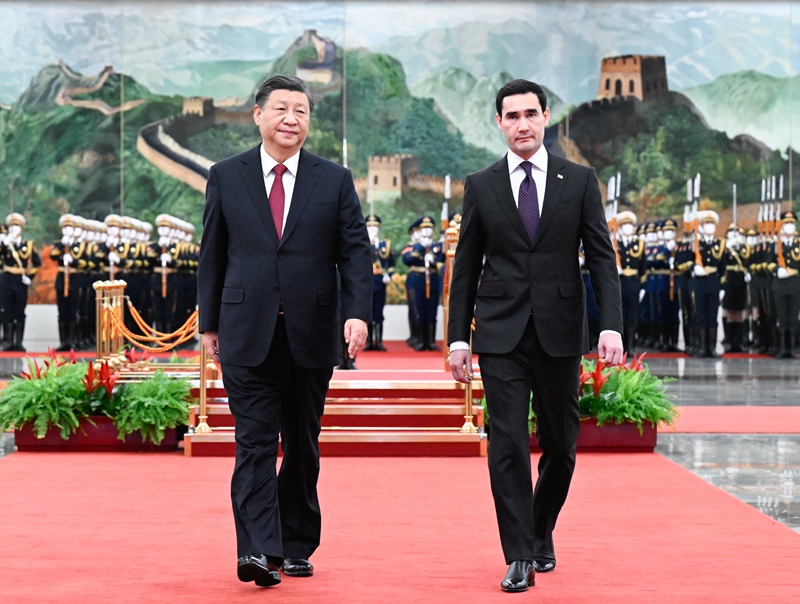 謝爾達(dá)爾·別爾德穆哈梅多夫在習(xí)近平陪同下檢閱中國人民解放軍儀仗隊(duì)。