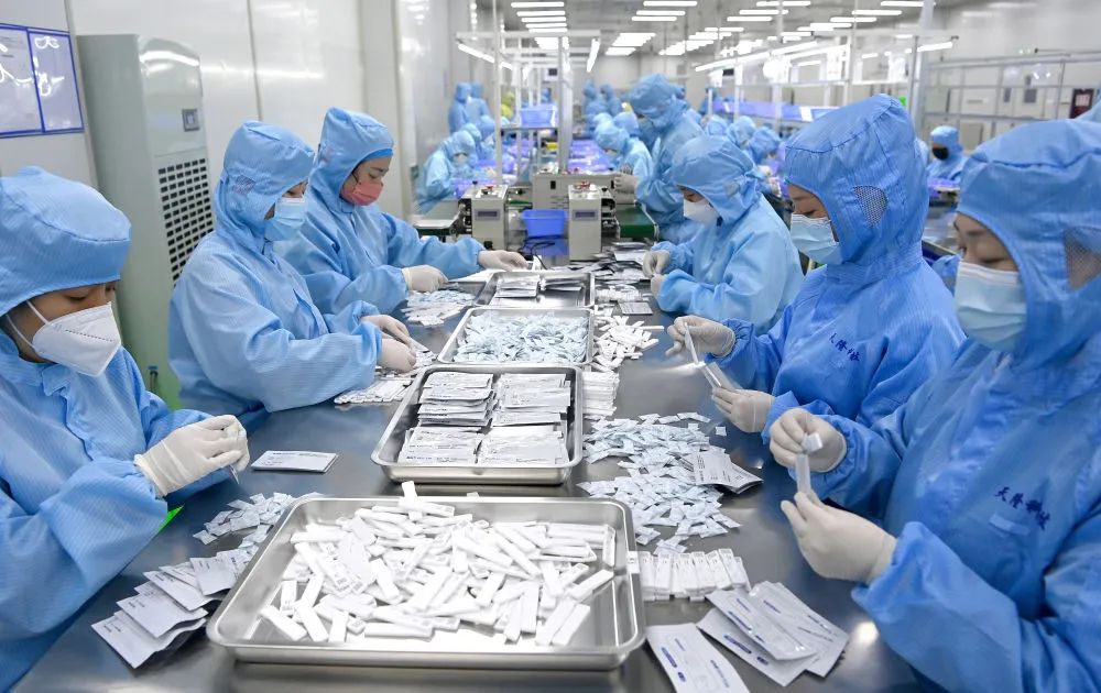 西安一家醫(yī)療器械企業(yè)的工作人員在生產(chǎn)抗原檢測試劑(2023年1月4日攝)。新華社記者 劉瀟 攝