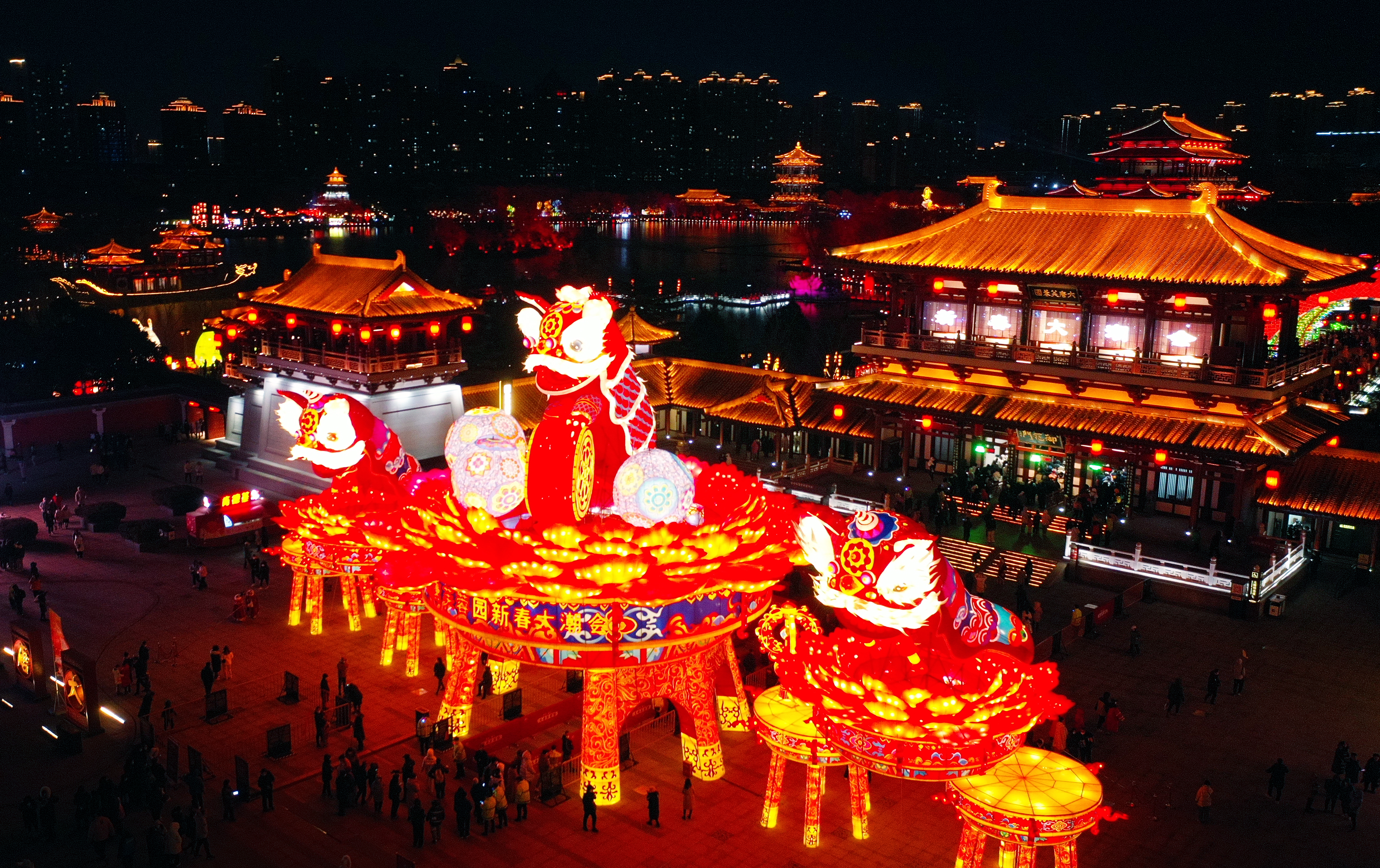 1月24日,游人在西安大唐芙蓉園內(nèi)觀賞花燈(無(wú)人機(jī)照片)。新華社記者 劉瀟 攝