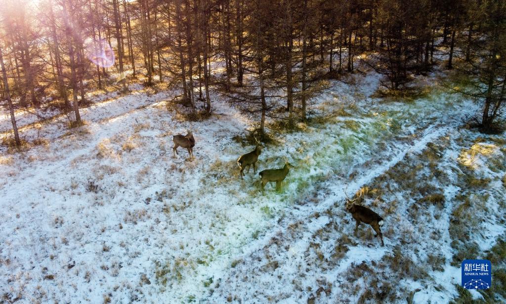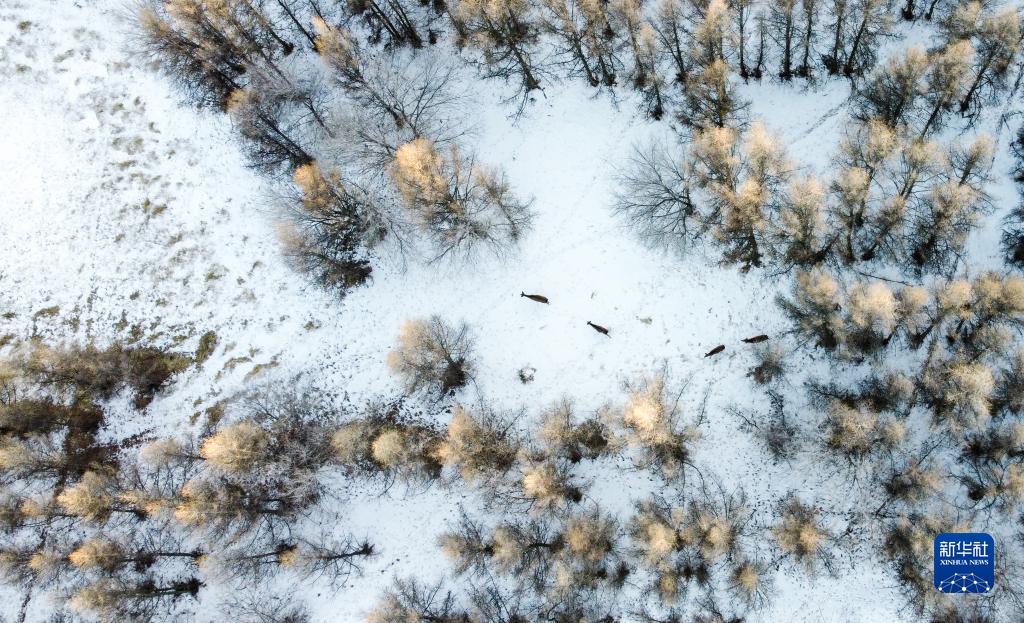 1月29日,一群馬鹿在灤河源國(guó)家森林公園內(nèi)覓食(無(wú)人機(jī)照片)。新華社記者 賀書琛 攝