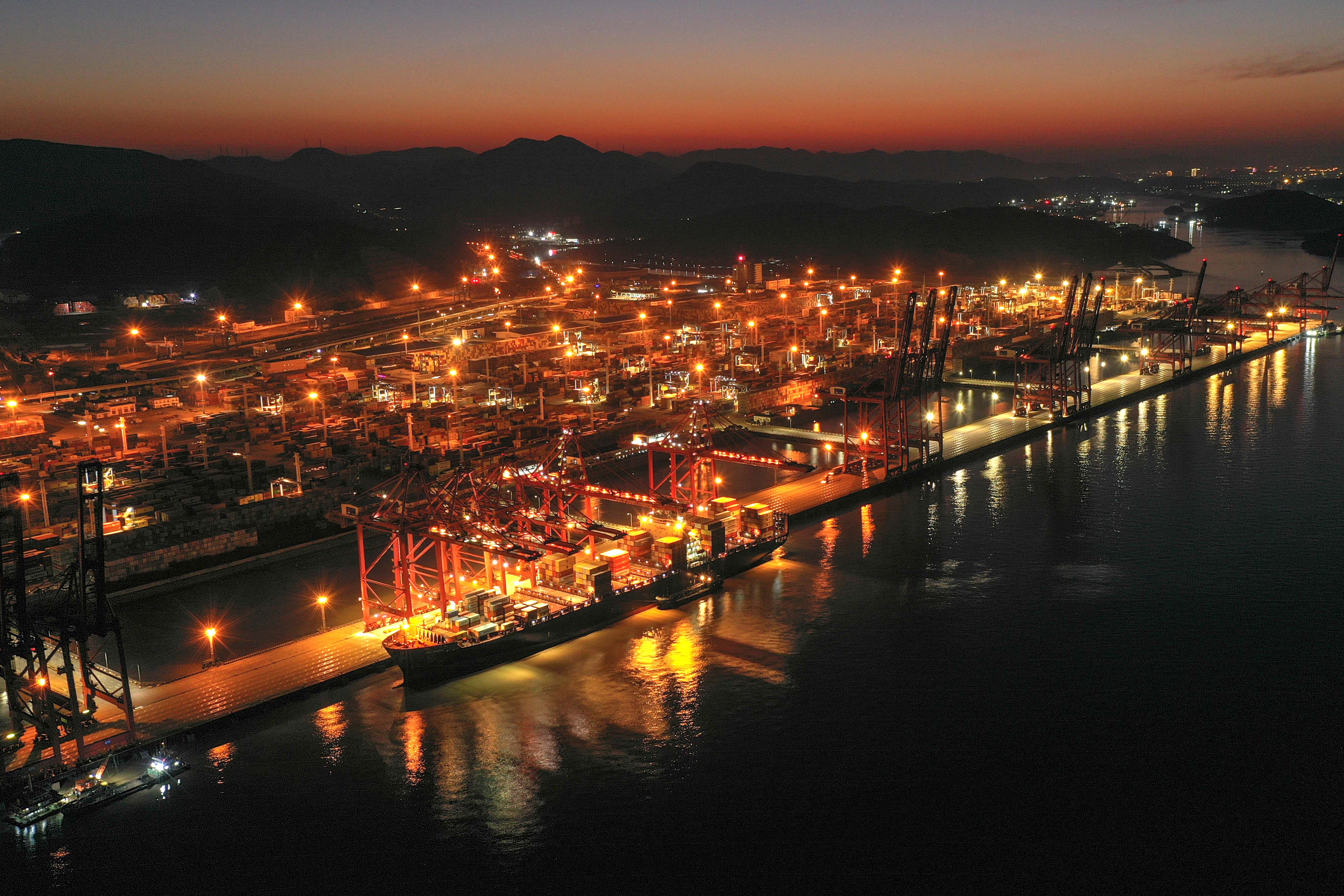 夜幕下,一艘貨輪停靠在寧波舟山港穿山港區(qū)集裝箱碼頭(2023年1月31日攝,無人機照片)。2022年寧波舟山港完成年貨物吞吐量超12.5億噸,連續(xù)14年位居全球第一;完成集裝箱吞吐量3335萬標準箱,位居全球第三。新華社記者 黃宗治 攝