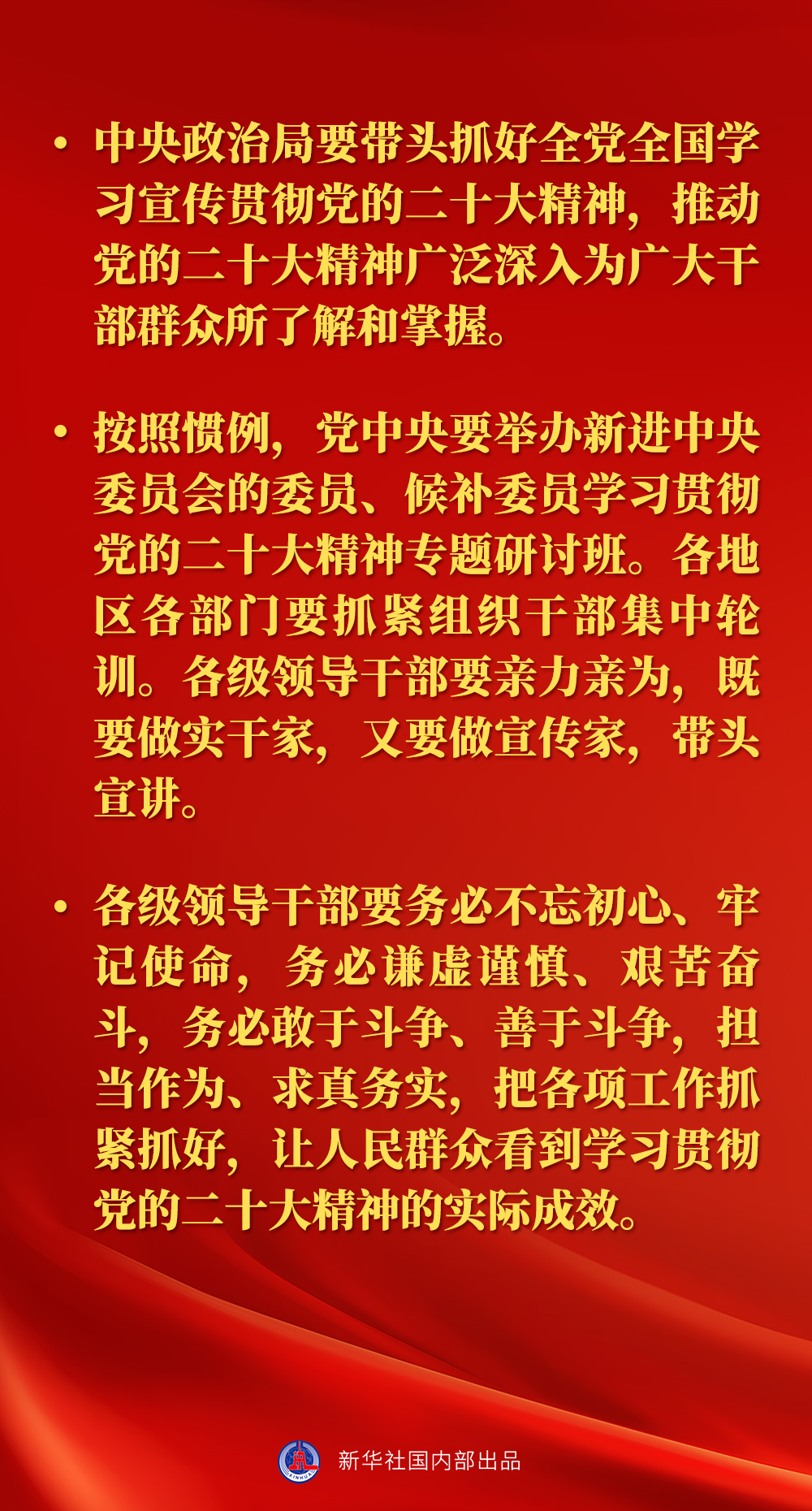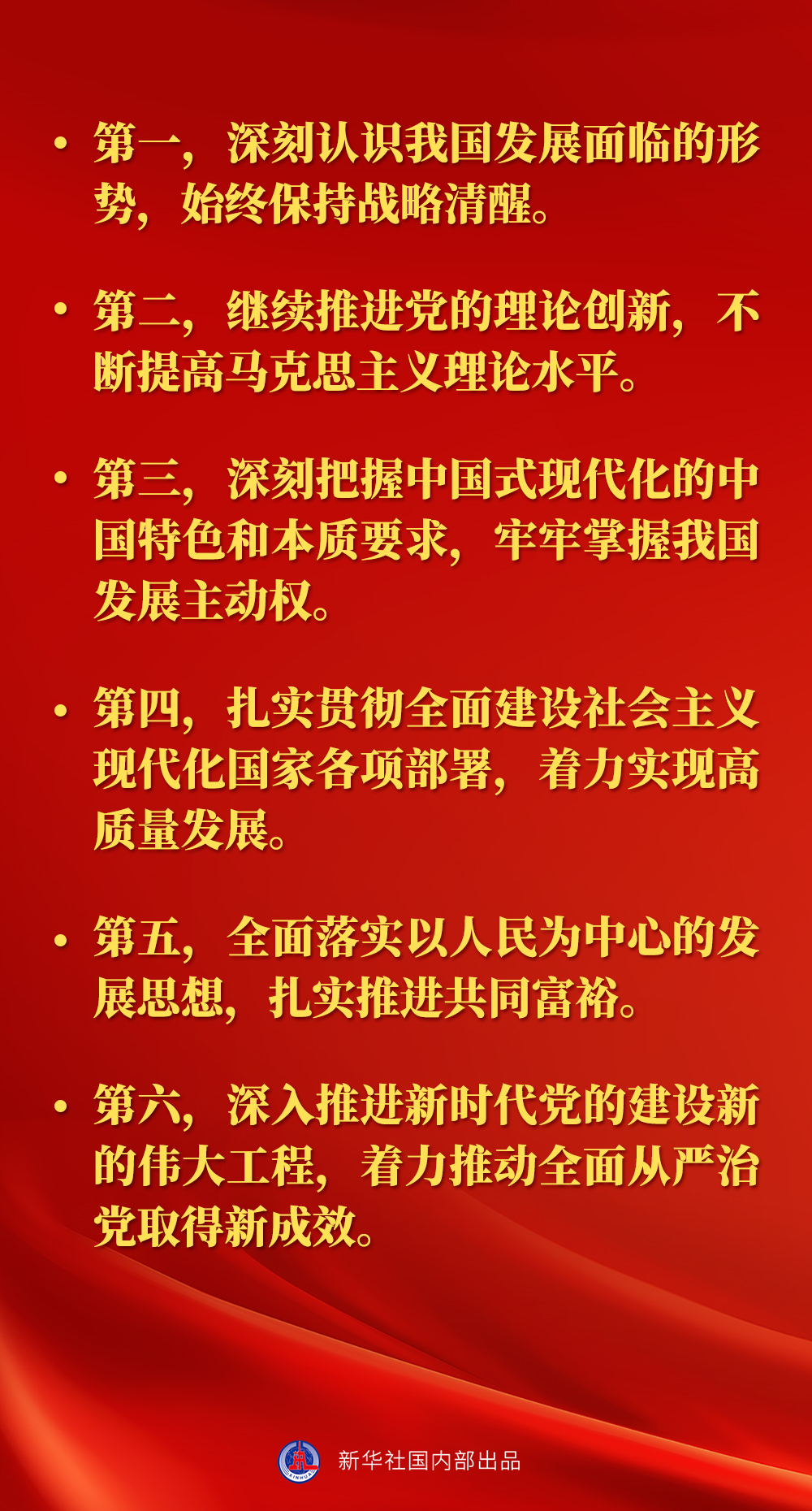 2022年10月23日,習(xí)近平總書(shū)記在黨的二十屆一中全會(huì)上指出,全面貫徹黨的二十大精神,為實(shí)現(xiàn)黨的二十大確定的目標(biāo)任務(wù)而團(tuán)結(jié)奮斗,是新一屆中央領(lǐng)導(dǎo)集體的重大政治任務(wù)。當(dāng)前和今后一個(gè)時(shí)期,我們要著重做好以下幾方面工作——