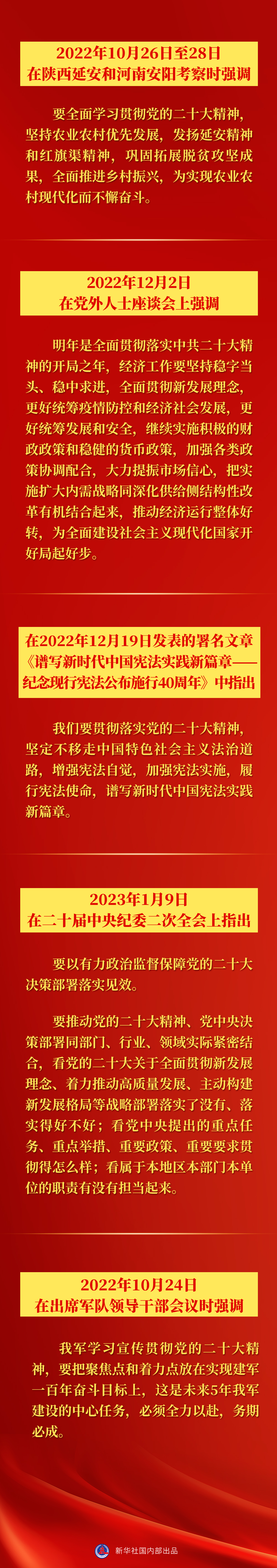 一分部署,九分落實(shí)。黨的二十大以來(lái),針對(duì)各項(xiàng)具體工作,習(xí)近平總書(shū)記在多個(gè)場(chǎng)合就學(xué)習(xí)貫徹黨的二十大精神提出要求——
