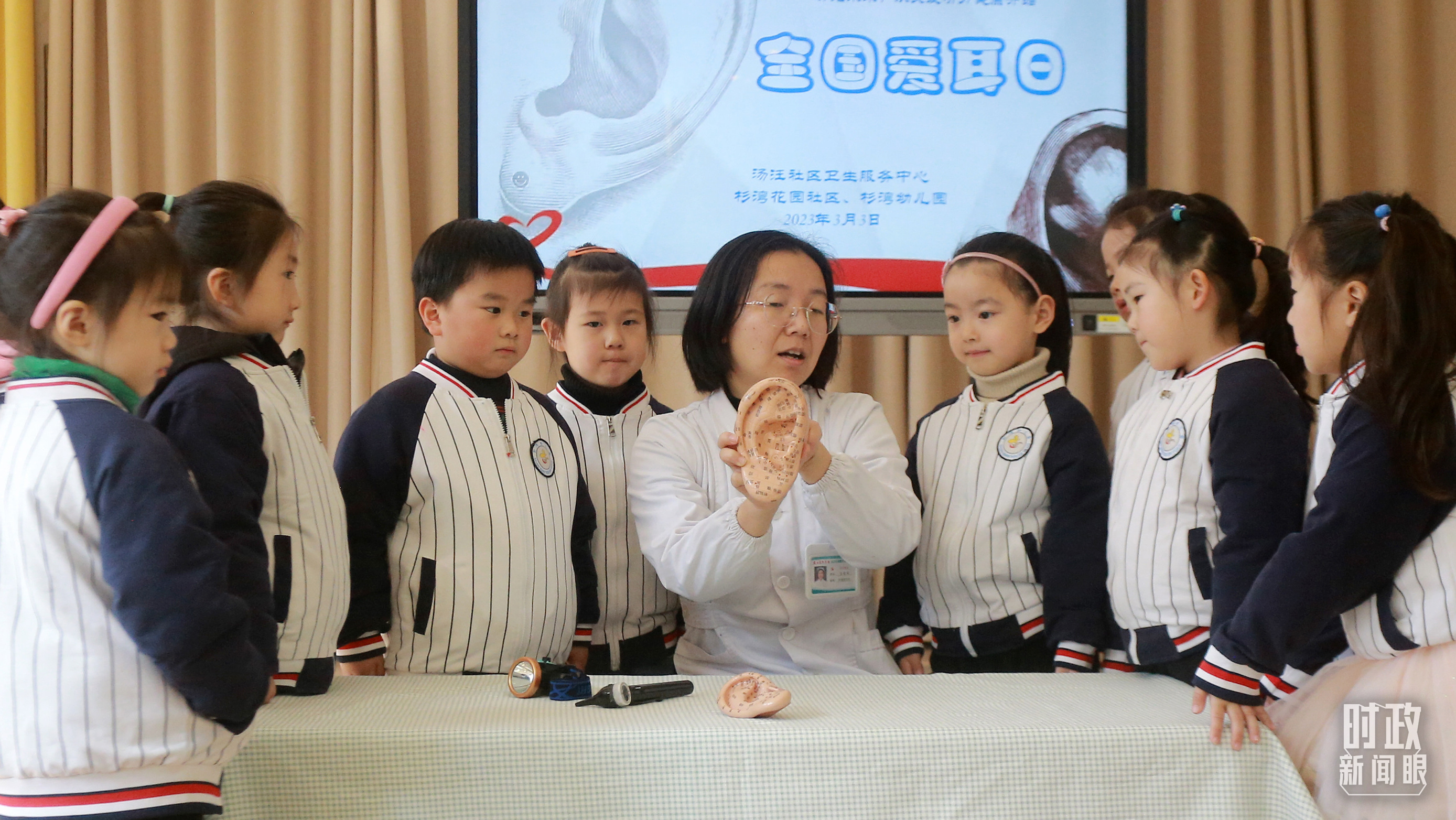 △2023年3月3日,全國愛耳日當(dāng)天,江蘇揚(yáng)州一位社區(qū)醫(yī)生正在為小朋友們講解護(hù)耳知識。(圖/視覺中國)