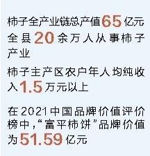 舉辦富平尖柿節(jié)活動、2022富平柿餅精品展暨亞洲果蔬產業(yè)博覽會,亮相2022華糖萬商大會……近年來,富平縣持續(xù)推動柿子產品“走出去”,“富平柿餅”品牌效應日益凸顯。在2021中國品牌價值評價榜中,地理標志區(qū)域品牌“富平柿餅”的品牌強度為820,品牌價值為51.59億元,位居全國第69位。