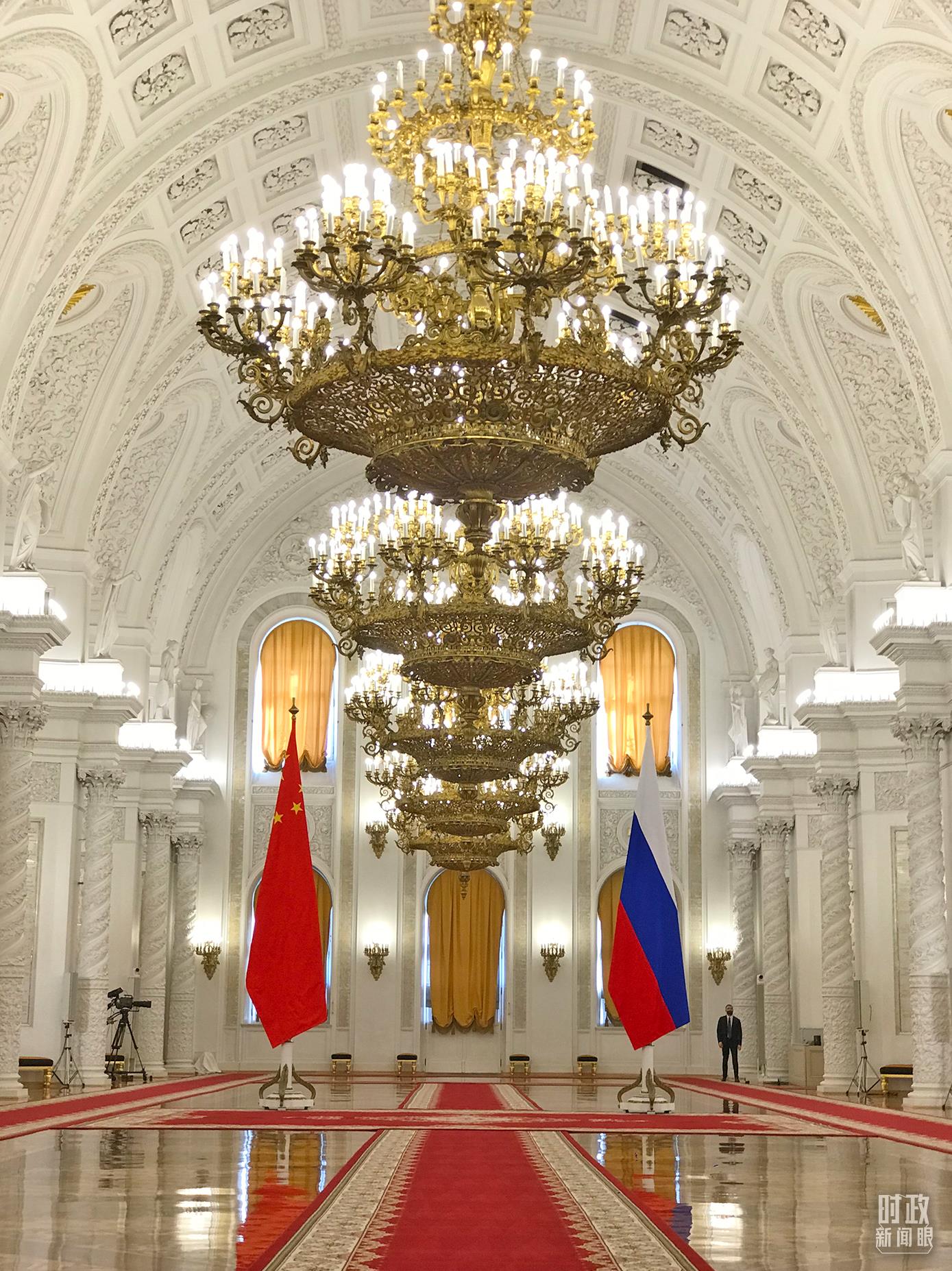 金色的燈盞、白色的浮雕、紅色的地毯,當(dāng)天的喬治大廳璀璨、莊重。在雄壯激昂的迎賓曲中,習(xí)主席和普京總統(tǒng)分別從喬治大廳兩側(cè)沿紅地毯闊步走入大廳中央,兩國元首緊緊握手,合影留念。