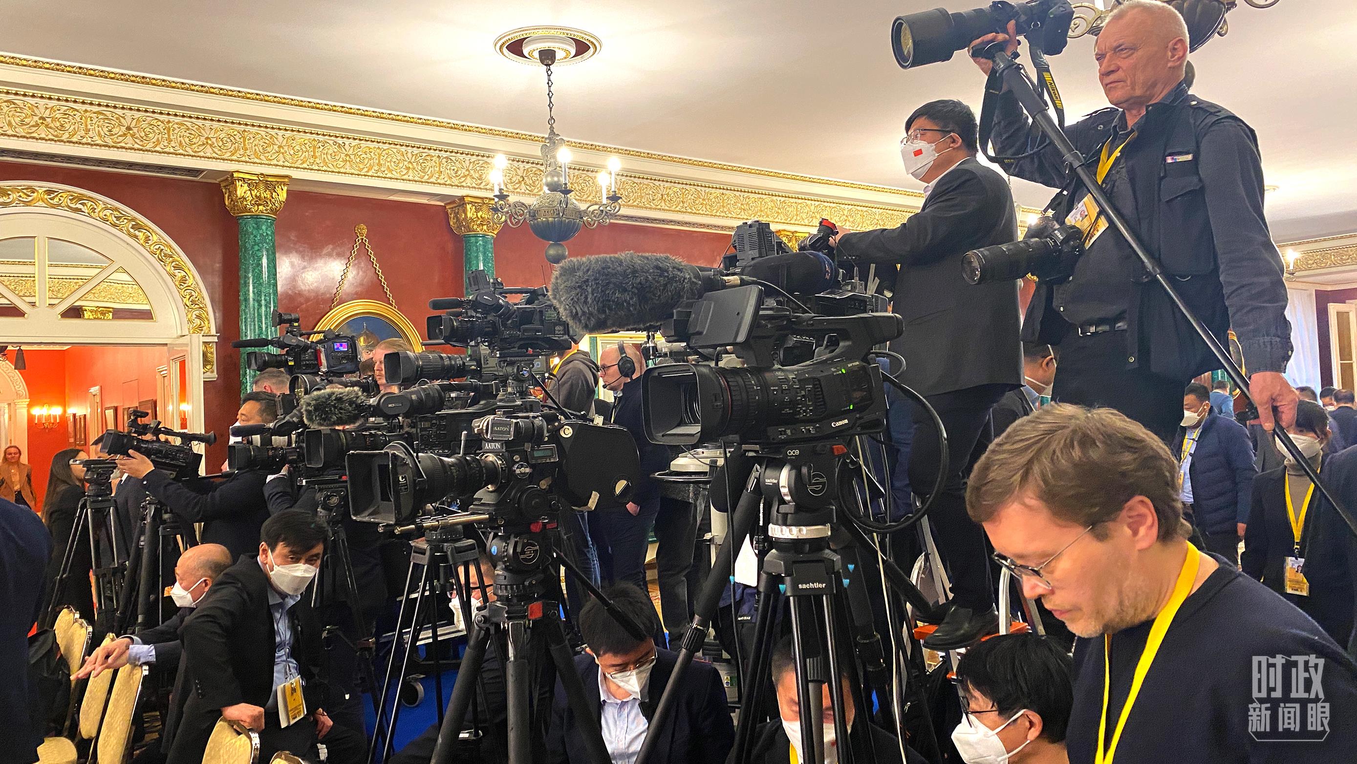 △等待中俄兩國元首共見記者的中外媒體同仁。(總臺央視記者段德文、李輝拍攝)