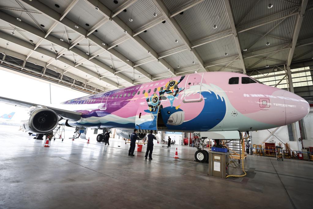 2023年3月7日,在海口美蘭國際機場,南航機務(wù)人員對“消博號”彩繪飛機進行深度檢查。新華社記者 張麗蕓 攝