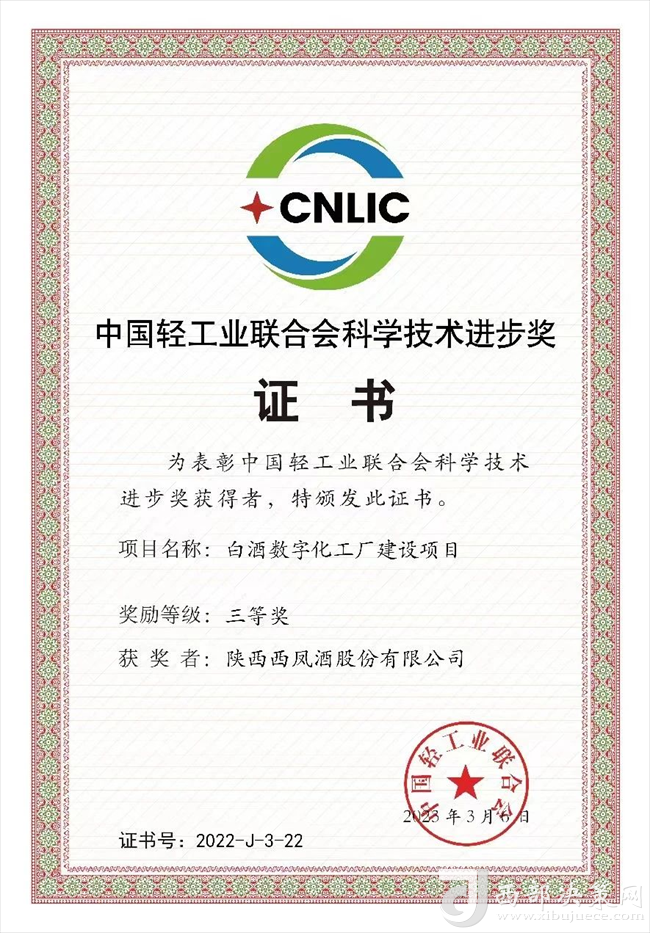 西部決策網(wǎng)訊(記者劉玉 韓宗憲 通訊員吳婷蘭 馬迪)近日,中國輕工業(yè)聯(lián)合會五屆三次、中華全國手工業(yè)合作總社八屆三次理事會在福建廈門召開。會議宣讀了《2022年度中國輕工聯(lián)合會科技獎決定》并舉行了頒獎儀式,陜西西鳳酒股份有限公司申報的“白酒數(shù)字化工廠建設(shè)項目”榮獲科學(xué)技術(shù)進(jìn)步三等獎。