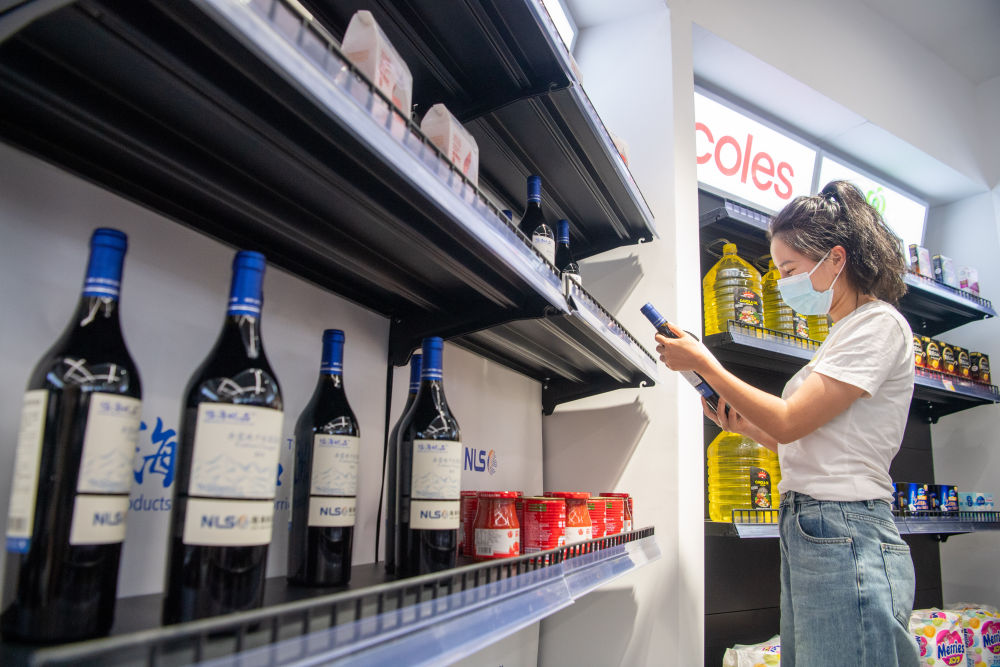 消費者在位于重慶解放碑的“陸海新通道國際消費中心”選購商品(2022年5月28日攝)。新華社記者 唐奕 攝