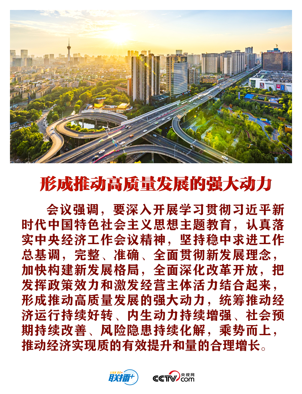 會議認為,今年以來,在以習近平同志為核心的黨中央堅強領導下,我國經濟社會全面恢復常態(tài)化運行,經濟增長好于預期,市場需求逐步恢復,經濟發(fā)展呈現回升向好態(tài)勢,經濟運行實現良好開局。同時,會議指出,當前我國經濟運行好轉主要是恢復性的,經濟轉型升級面臨新的阻力,推動高質量發(fā)展仍需要克服不少困難挑戰(zhàn)。