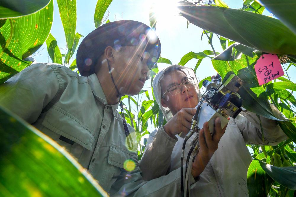 △2022年8月17日,在吉林梨樹縣,科技志愿者們在試驗(yàn)田里測量玉米光合作用。