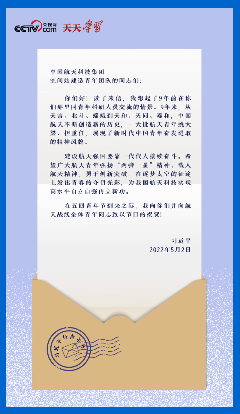 2022年5月2日,在五四青年節(jié)到來(lái)之際,中國(guó)航天科技集團(tuán)空間站建造青年團(tuán)隊(duì)收到了一份特別的節(jié)日禮物——一封落款為“習(xí)近平”的回信。