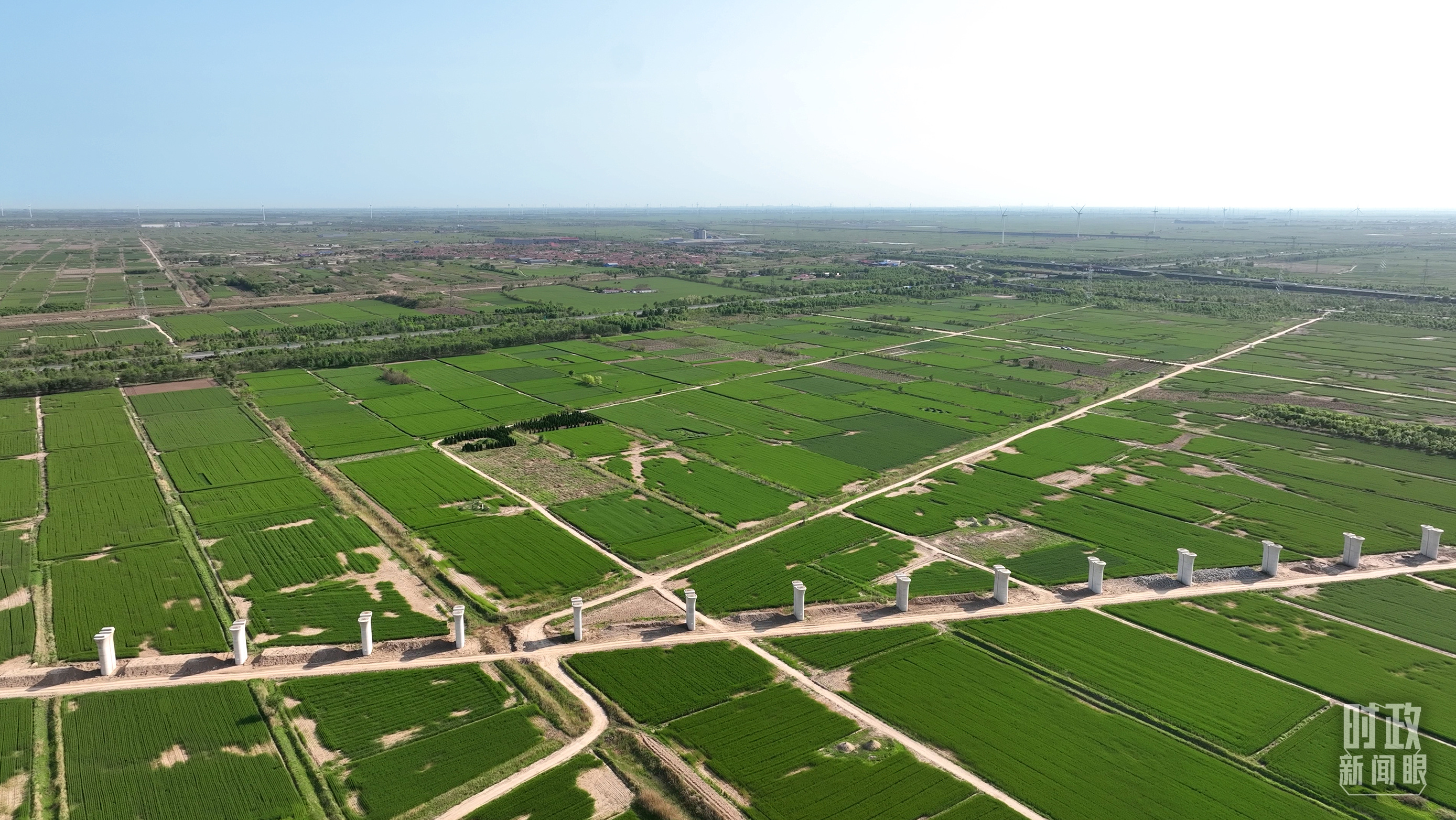 △旱堿麥田被分割成整齊劃一的綠色方塊。(總臺記者郭永良拍攝)