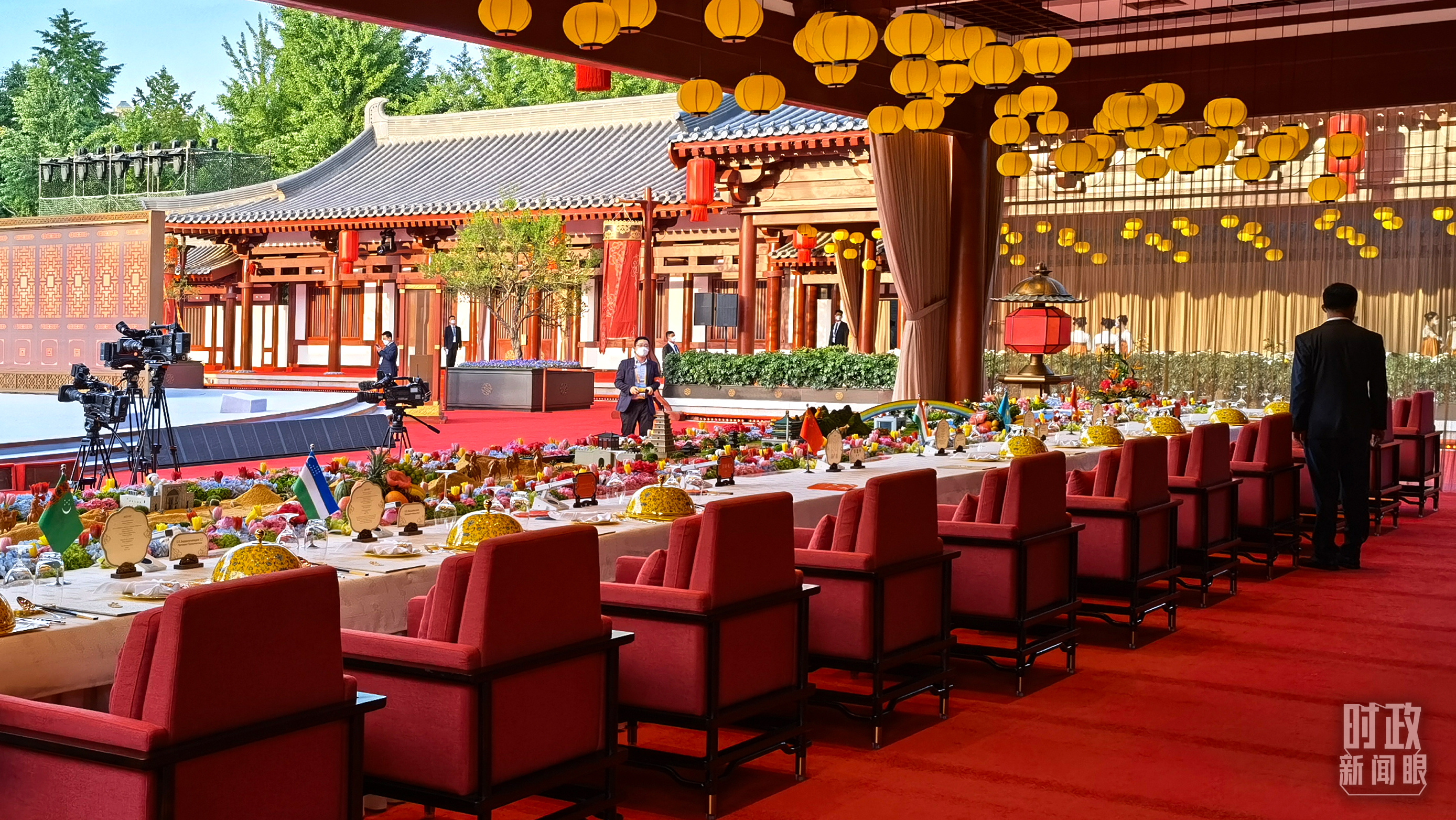 △歡迎晚宴的餐臺(tái)設(shè)計(jì)融入古絲綢之路和“一帶一路”元素,并穿插中國(guó)和中亞五國(guó)的標(biāo)志性建筑,獨(dú)具匠心。(總臺(tái)央視記者石丞拍攝)