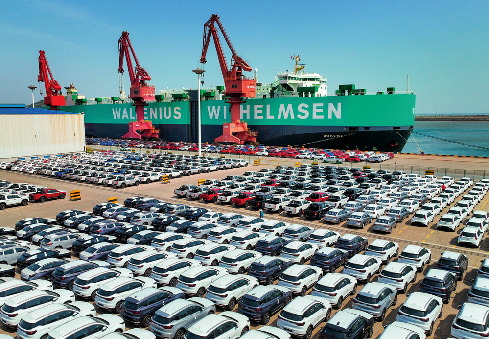 一艘滾裝船在江蘇連云港港東方港務(wù)分公司碼頭裝運出口汽車(2023 年 5 月 16 日攝) 王健民攝 / 本刊