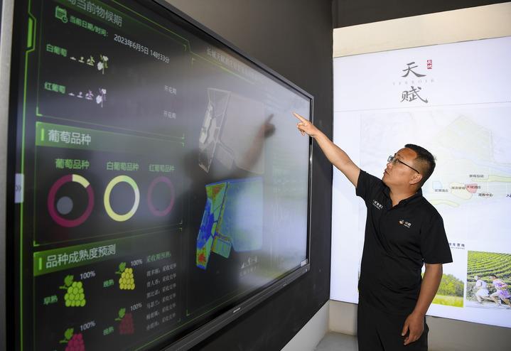 6月5日,中糧長城天賦酒莊總經(jīng)理都振江在介紹酒莊的智慧葡萄園灌溉數(shù)據(jù)平臺(tái)。新華社記者 馮開華 攝