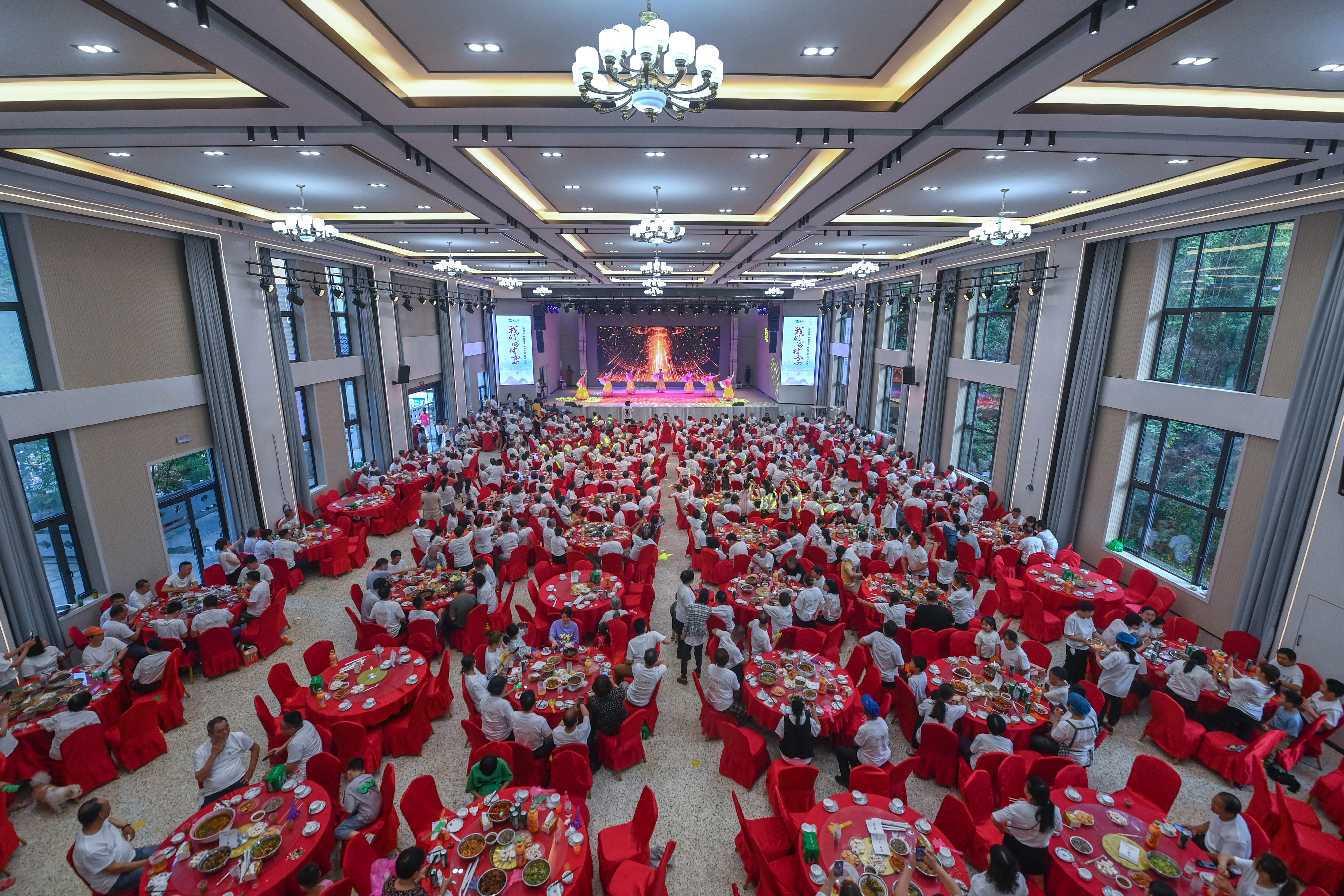 浙江建德市新安江街道梅坪村村民在村文化禮堂內參加百家宴并觀看文藝演出(2023年5月27日攝)。新華社記者 徐昱 攝