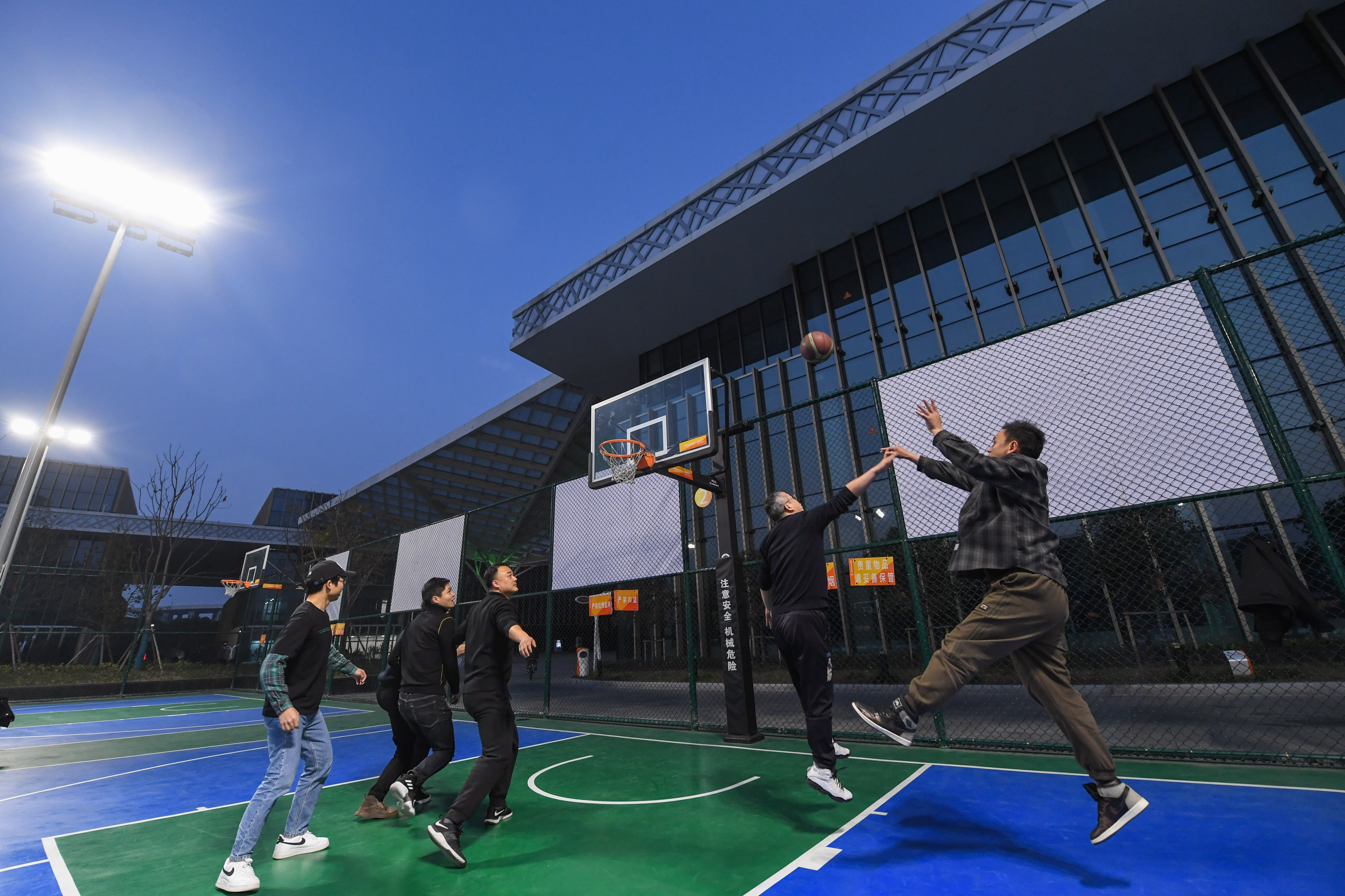 村民們在浙江省湖州市吳興區(qū)織里鎮(zhèn)文體中心的燈光球場打籃球(2022年1月18日攝)。新華社記者 徐昱 攝
