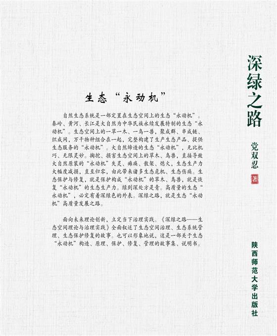 面向未來(lái)理論創(chuàng)新,立定當(dāng)下治理實(shí)踐?!渡罹G之路——生態(tài)空間理論與治理實(shí)踐》全面敘述了生態(tài)空間治理、生態(tài)系統(tǒng)管理、生態(tài)保護(hù)修復(fù)的故事。也可以形象地說(shuō),這是一部關(guān)于生態(tài)“永動(dòng)機(jī)”構(gòu)造、原理、保護(hù)、修復(fù)、管理的故事集、說(shuō)明書。