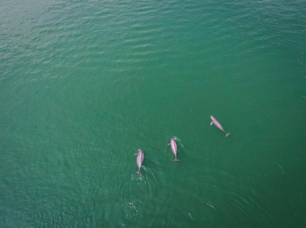 長(zhǎng)江江豚在水中嬉戲(2021年5月11日攝,無(wú)人機(jī)照片)。新華社記者肖藝九 攝