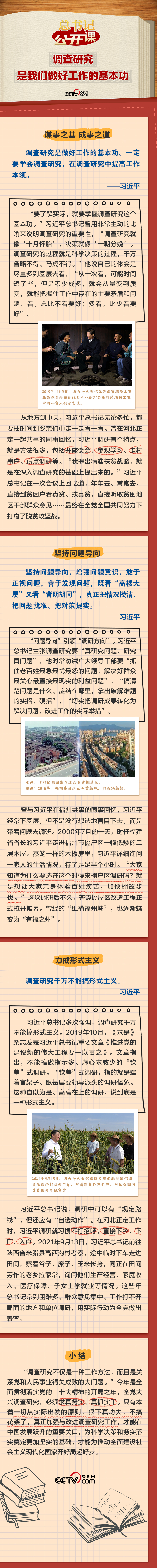 “調(diào)查研究是謀事之基、成事之道,沒有調(diào)查就沒有發(fā)言權(quán),沒有調(diào)查就沒有決策權(quán)。調(diào)查研究是我們做好工作的基本功。”習(xí)近平總書記非常重視調(diào)查研究,并一以貫之身體力行、率先垂范,推動全黨大興調(diào)查研究之風(fēng)。本期《總書記“公開課”》聚焦總書記關(guān)于調(diào)查研究的所思所言所行,讓我們一起學(xué)習(xí)領(lǐng)會。