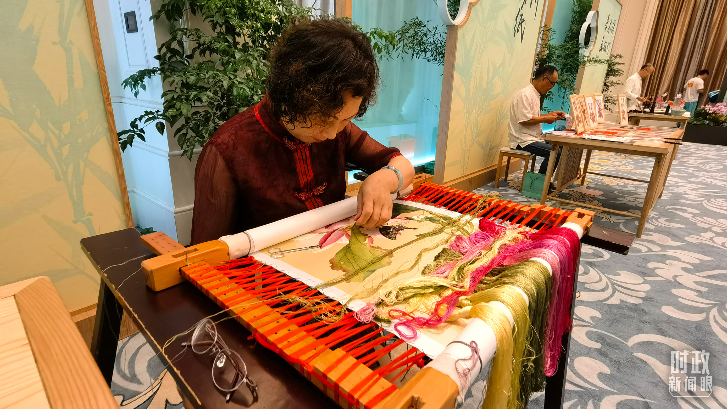 △為國際貴賓展示的四川非物質(zhì)文化遺產(chǎn)棕編和蜀繡。(總臺央視記者蔣碩、韓銳拍攝)