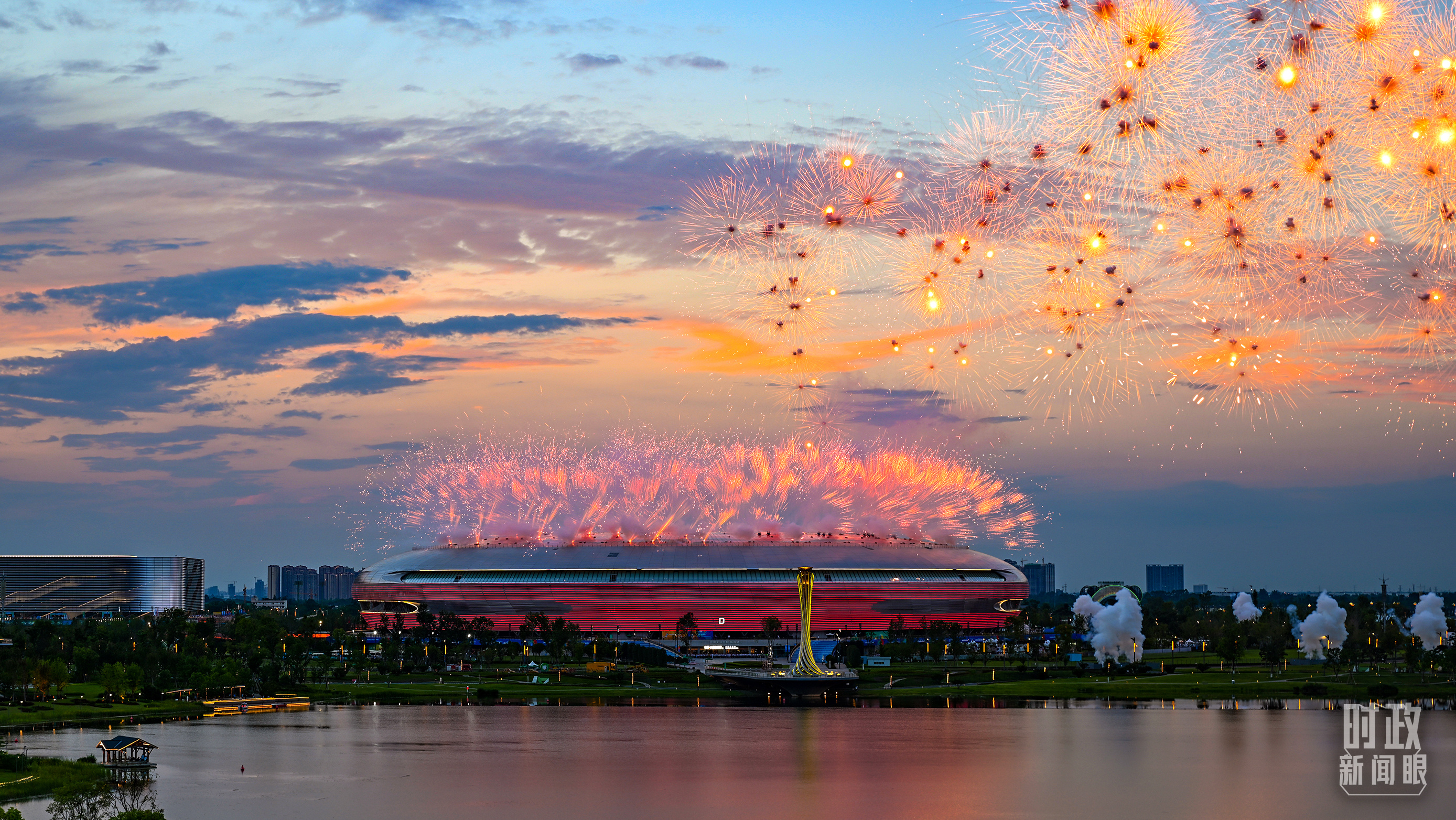 晚上,東安湖體育公園主體育場,習近平主席同國際貴賓共同出席成都大運會開幕式。