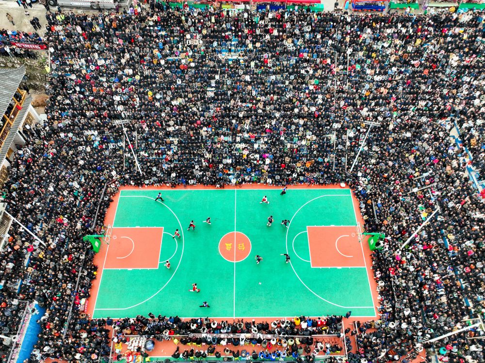 這是2023年3月27日在黔東南州臺(tái)江縣臺(tái)盤村拍攝的貴州省首屆“美麗鄉(xiāng)村”籃球聯(lián)賽總決賽比賽現(xiàn)場(無人機(jī)照片)。新華社記者 歐東衢 攝
