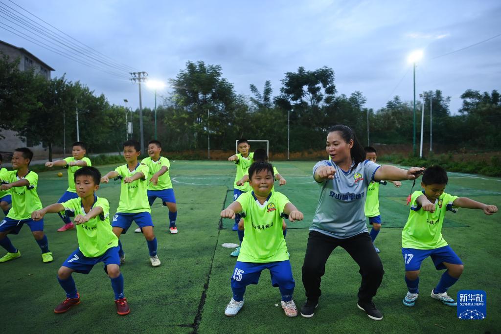 8月7日晚,孩子們在足球場上進行訓練(無人機照片)。
