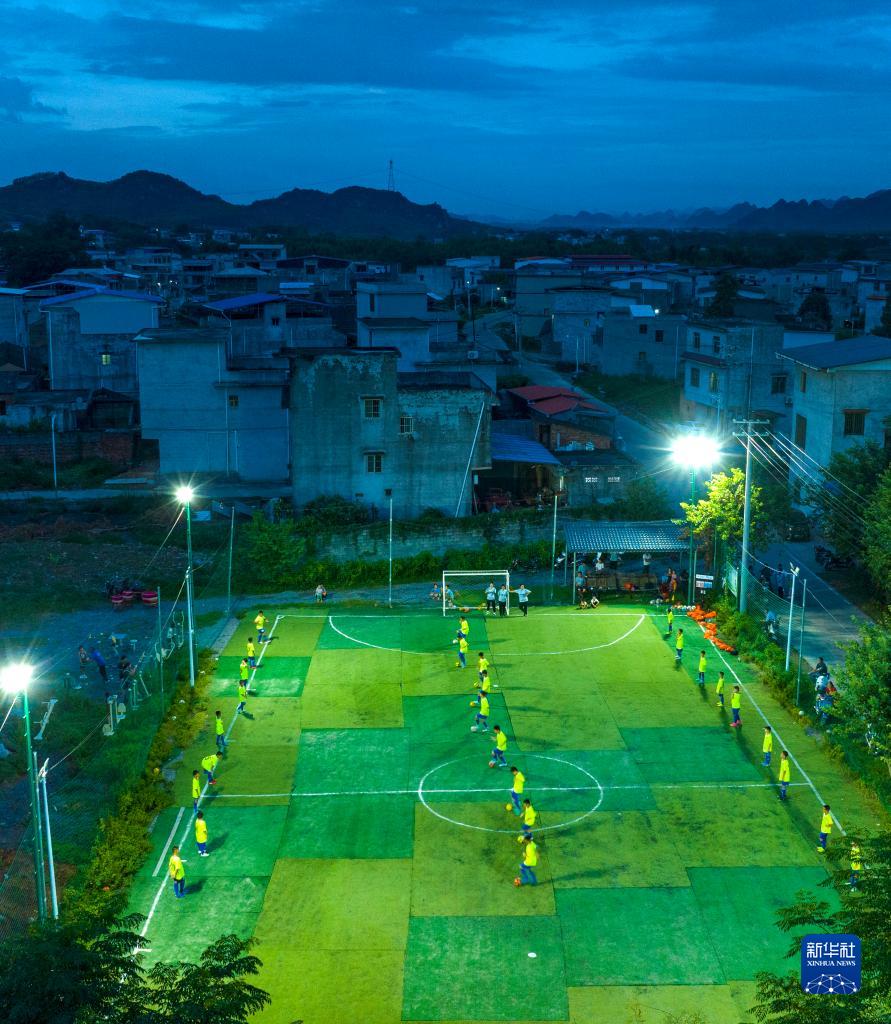 平地屯是位于廣西柳州市柳江區(qū)穿山鎮(zhèn)的一個小山村。8月7日晚,為期近1個月的平地屯暑期公益足球夏令營結(jié)束,一場匯報訓練成果的足球?qū)官愒诖謇锏木G茵場上打響,吸引眾多村民觀賽。2020年,平地屯的村民組成義務勞動隊,為孩子們修建專用足球場,社會愛心人士為他們捐贈了人工草坪、球門、球場照明燈等設施,公益足球教練定期免費為孩子們培訓,眾人聯(lián)合起來,給村里喜歡足球的孩子們點燃了綠茵夢想。