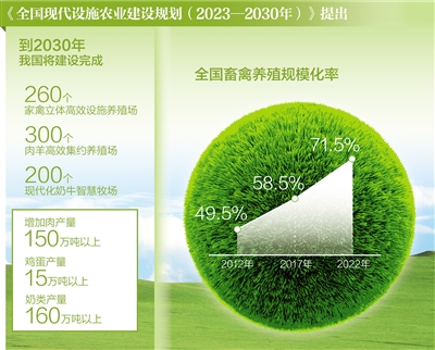 規(guī)?;O(shè)施化養(yǎng)殖助推畜牧業(yè)綜合產(chǎn)能提升?!度珖?guó)現(xiàn)代設(shè)施農(nóng)業(yè)建設(shè)規(guī)劃(2023—2030年)》(以下簡(jiǎn)稱《規(guī)劃》)提出,到2030年建設(shè)完成260個(gè)家禽立體高效設(shè)施養(yǎng)殖場(chǎng)、200個(gè)肉牛高效集約養(yǎng)殖場(chǎng)、300個(gè)肉羊高效集約養(yǎng)殖場(chǎng)和200個(gè)現(xiàn)代化奶牛智慧牧場(chǎng),增加肉產(chǎn)量150萬(wàn)噸以上、雞蛋產(chǎn)量15萬(wàn)噸以上、奶類產(chǎn)量160萬(wàn)噸以上,我國(guó)的肉蛋奶供應(yīng)保障水平將進(jìn)一步提高。