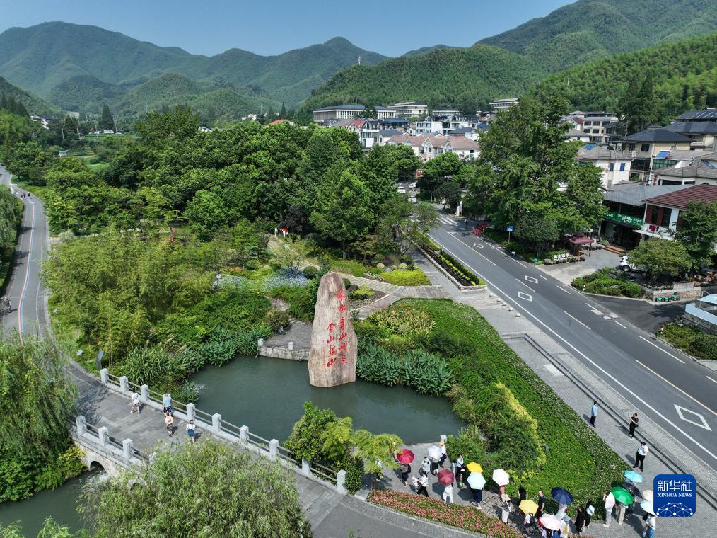 8月11日,游客在安吉余村的綠水青山間參觀(無(wú)人機(jī)照片)。