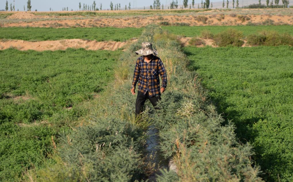 楊應(yīng)學(xué)在查看毛渠水量。新華社記者 李旭倫 攝