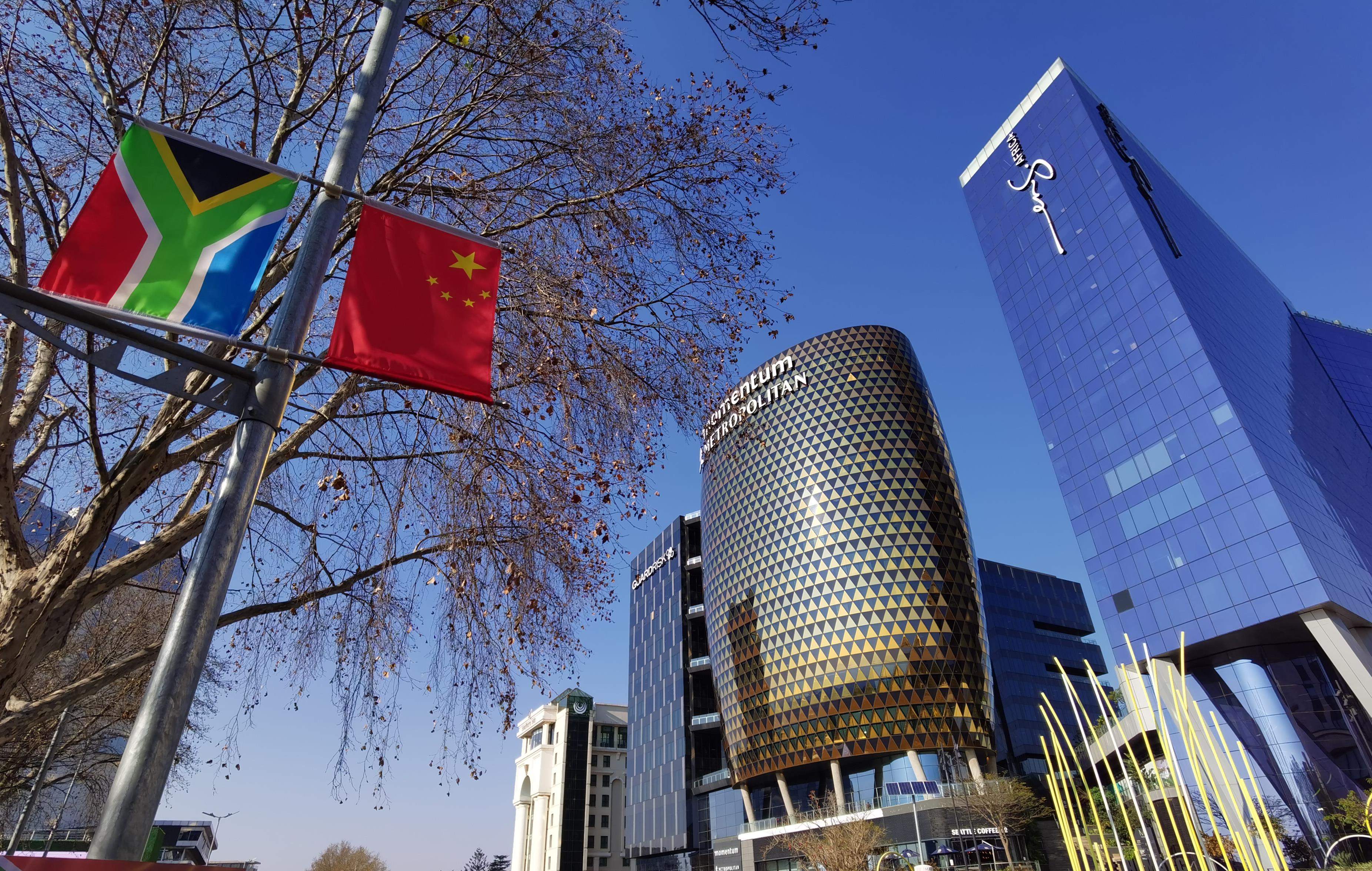 △南非約翰內(nèi)斯堡街頭懸掛著中國(guó)和南非兩國(guó)國(guó)旗