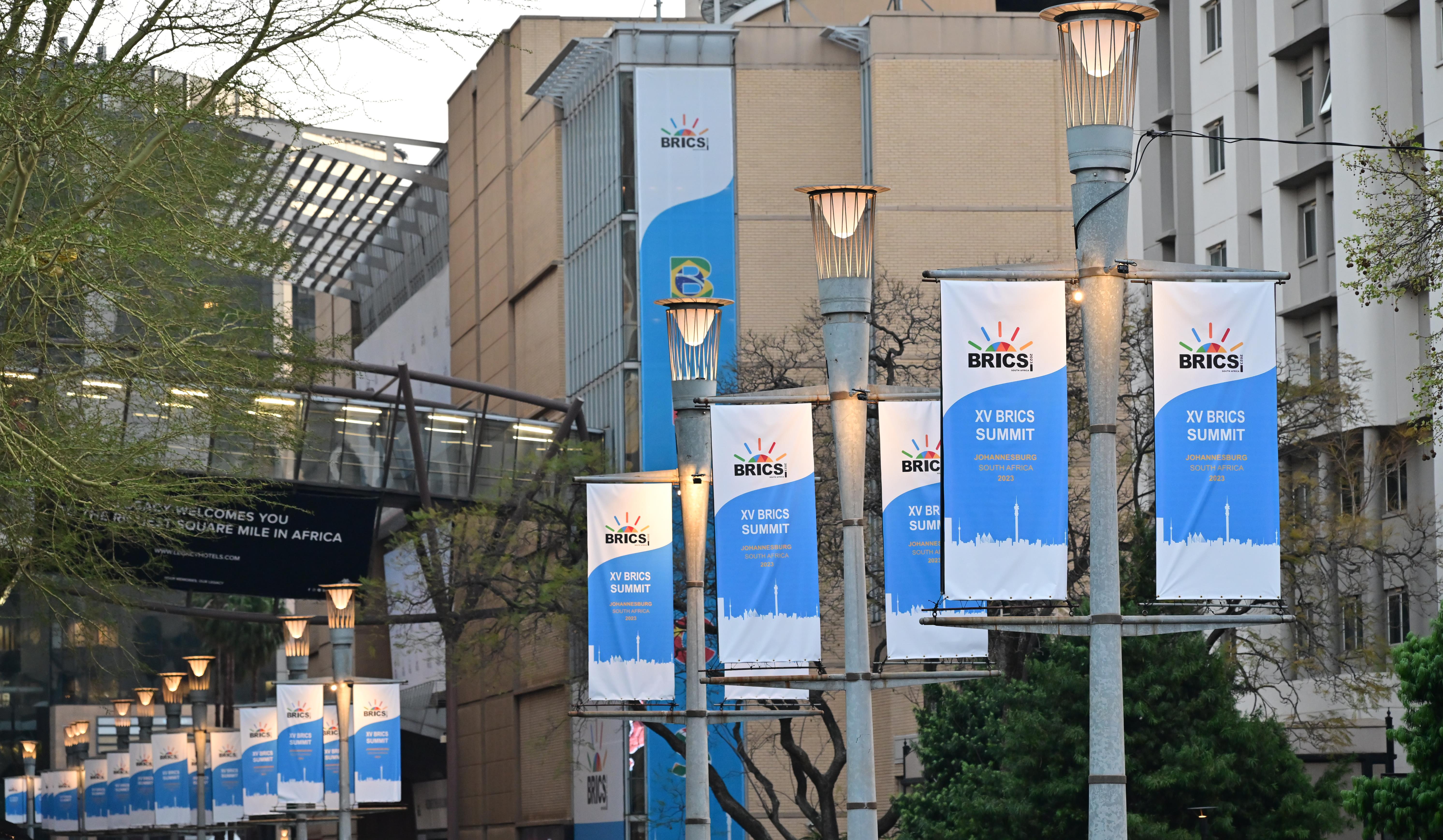 △南非約翰內(nèi)斯堡街頭懸掛的金磚峰會(huì)視覺(jué)海報(bào)