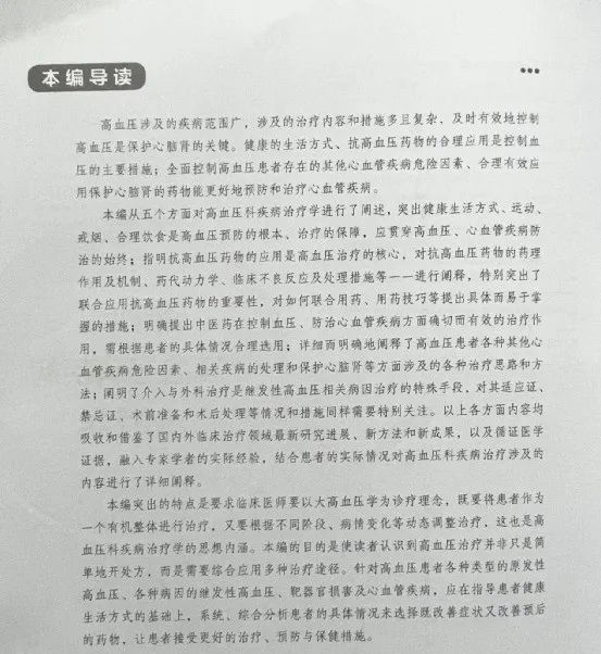 該書每一編都有一個導(dǎo)讀,指導(dǎo)讀者怎樣學(xué)習(xí)使用相關(guān)內(nèi)容,在閱讀每編、章、節(jié)前都能構(gòu)建好系統(tǒng)的理論知識框架,順利把握好各章節(jié)中的重點(diǎn)、難點(diǎn)及疑點(diǎn),更好地汲取書中的教學(xué)方法及研究成果。如第四編“高血壓科疾病治療學(xué)”從健康生活方式、抗高血壓藥物、中醫(yī)藥、相關(guān)疾病處理和介入與外科手術(shù)等五個方面對高血壓科疾病治療學(xué)進(jìn)行了闡述。反映了高血壓涉及的疾病范圍廣,涉及的治療內(nèi)容和措施多且復(fù)雜,及時有效地控制高血壓是保護(hù)心腦腎的關(guān)鍵。健康的生活方式、抗高血壓藥物的合理應(yīng)用是控制血壓的主要措施;全面控制高血壓患者存在的其他心血管疾病危險因素、合理有效應(yīng)用保護(hù)心腦腎的藥物能更好地預(yù)防和治療心血管疾病。