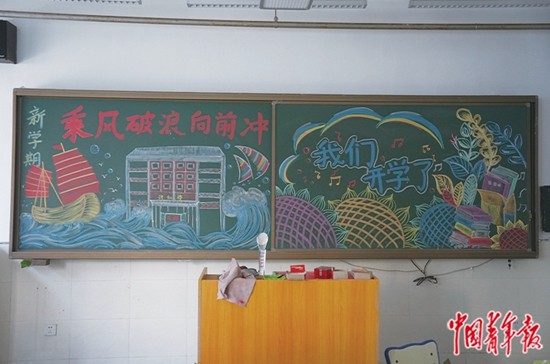 8月21日,北京市房山區(qū)石樓中學(xué)、夏村中學(xué)的師生一起畫出迎接開(kāi)學(xué)的黑板報(bào)。張藝/攝