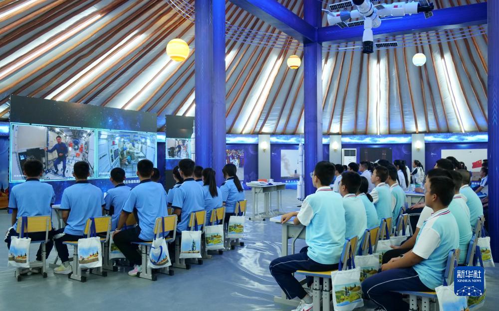 9月21日,在內(nèi)蒙古阿拉善盟額濟(jì)納旗,學(xué)生收看“天宮課堂”。新華社發(fā)(敖琪 攝)