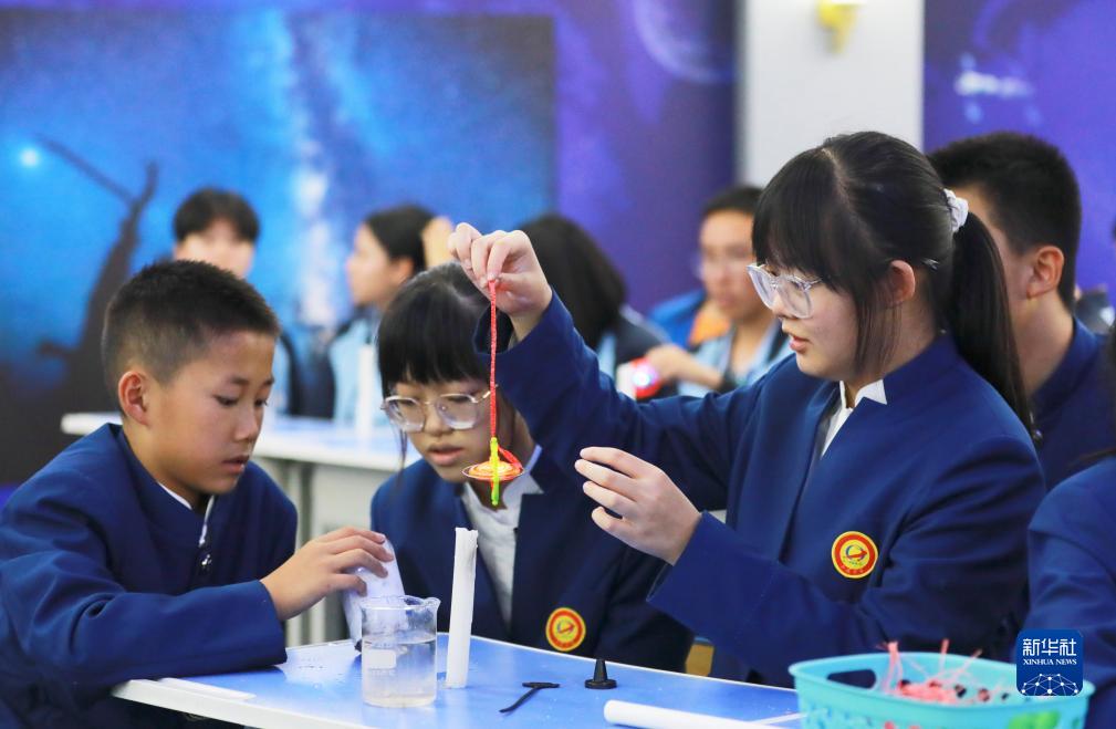 9月21日,在內(nèi)蒙古阿拉善盟額濟(jì)納旗,學(xué)生在做趣味實(shí)驗(yàn)。新華社發(fā)(敖琪 攝)
