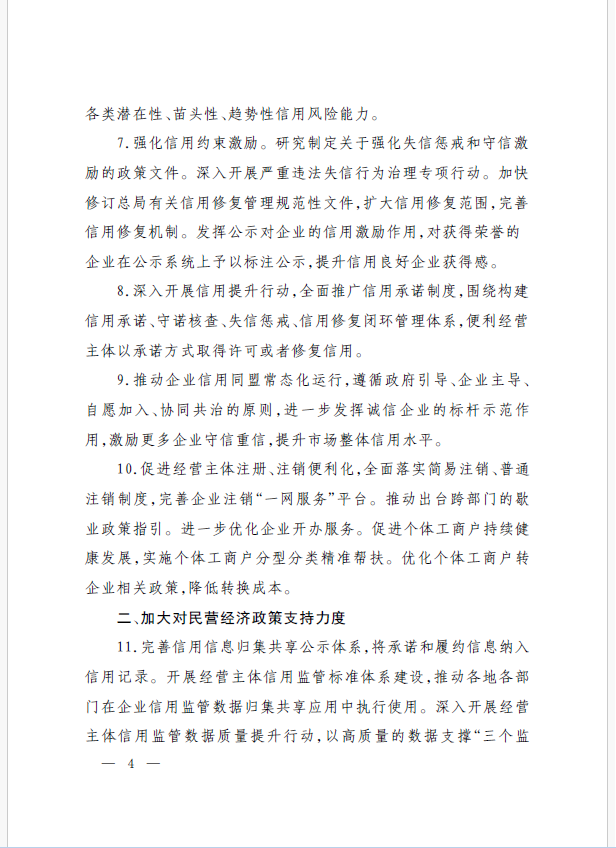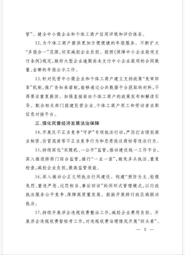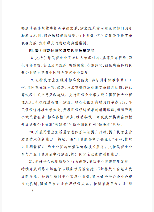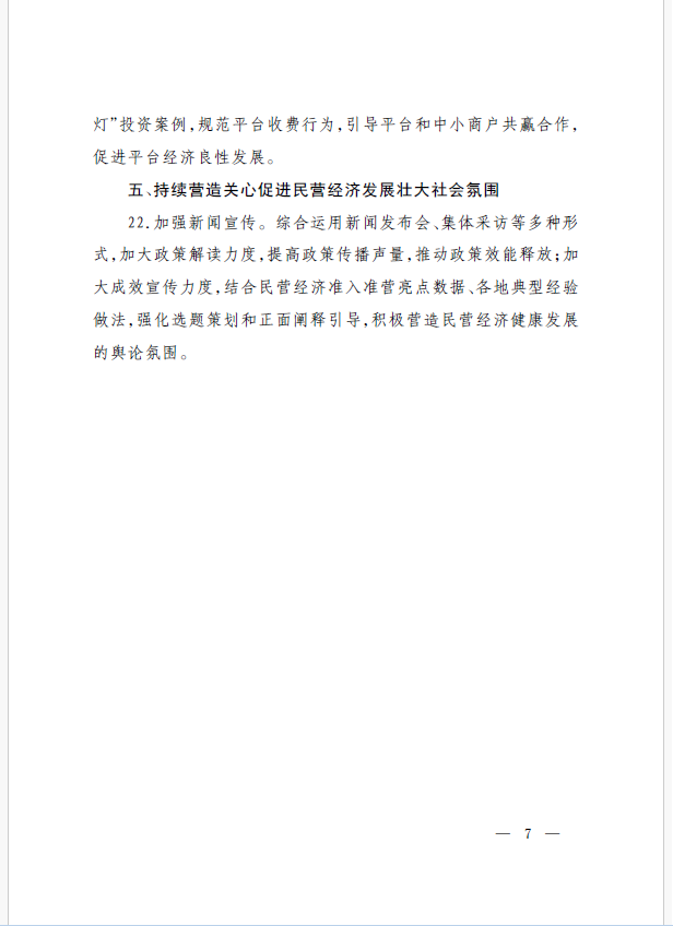 22條舉措聚焦五個(gè)方面,落實(shí)《意見(jiàn)》部署要求,回應(yīng)了民營(yíng)經(jīng)濟(jì)各類關(guān)切:一是持續(xù)優(yōu)化民營(yíng)經(jīng)濟(jì)發(fā)展環(huán)境。持續(xù)破除市場(chǎng)準(zhǔn)入壁壘,全面落實(shí)公平競(jìng)爭(zhēng)政策制度,強(qiáng)化制止濫用行政權(quán)力排除、限制競(jìng)爭(zhēng)的反壟斷執(zhí)法,完善社會(huì)信用激勵(lì)約束機(jī)制,健全失信行為糾正后的信用修復(fù)機(jī)制。二是加大對(duì)民營(yíng)經(jīng)濟(jì)政策支持力度。完善信用信息歸集共享,健全中小微企業(yè)和個(gè)體工商戶信用評(píng)級(jí)和評(píng)價(jià)體系。完善支持政策直達(dá)快享機(jī)制。三是強(qiáng)化民營(yíng)經(jīng)濟(jì)發(fā)展法治保障。持續(xù)完善知識(shí)產(chǎn)權(quán)保護(hù)體系,完善監(jiān)管執(zhí)法體系,杜絕選擇性執(zhí)法,健全涉企收費(fèi)長(zhǎng)效監(jiān)管機(jī)制。四是著力推動(dòng)民營(yíng)經(jīng)濟(jì)實(shí)現(xiàn)高質(zhì)量發(fā)展。支持民營(yíng)企業(yè)參與標(biāo)準(zhǔn)制定,計(jì)量服務(wù)中小企業(yè)。依法規(guī)范和引導(dǎo)民營(yíng)資本健康發(fā)展,推動(dòng)平臺(tái)經(jīng)濟(jì)健康發(fā)展。五是持續(xù)營(yíng)造關(guān)心促進(jìn)民營(yíng)經(jīng)濟(jì)發(fā)展壯大社會(huì)氛圍,及時(shí)推廣經(jīng)驗(yàn)做法,加大宣傳。
