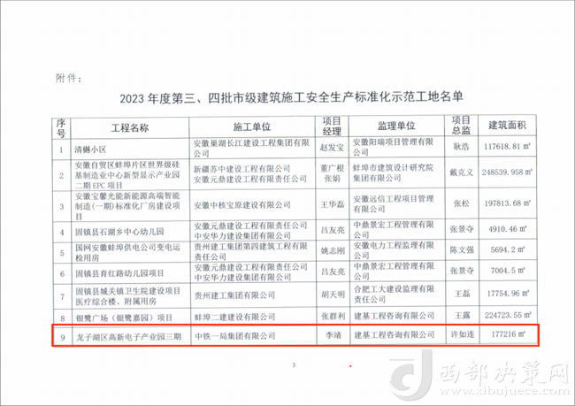 近日,安徽省蚌埠市建筑管理處下發(fā)2023年度第三、四批市級建筑施工安全生產(chǎn)標(biāo)準(zhǔn)化示范工地名單,公司龍子湖區(qū)高新電子產(chǎn)業(yè)園三期EPC項目欣然在列。