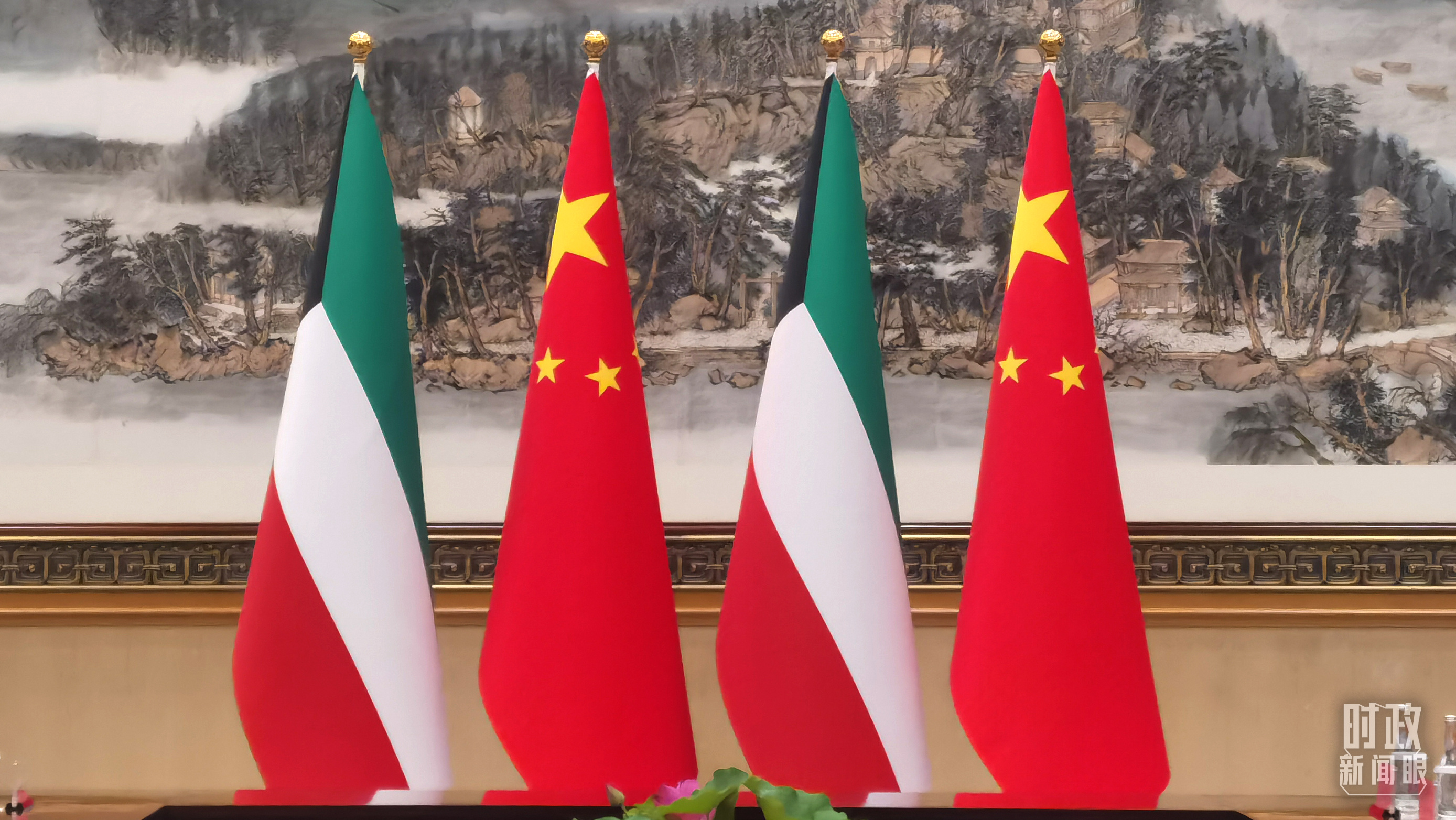△會見現(xiàn)場擺放的中國、科威特國旗。(總臺央視記者曹亞星拍攝)
