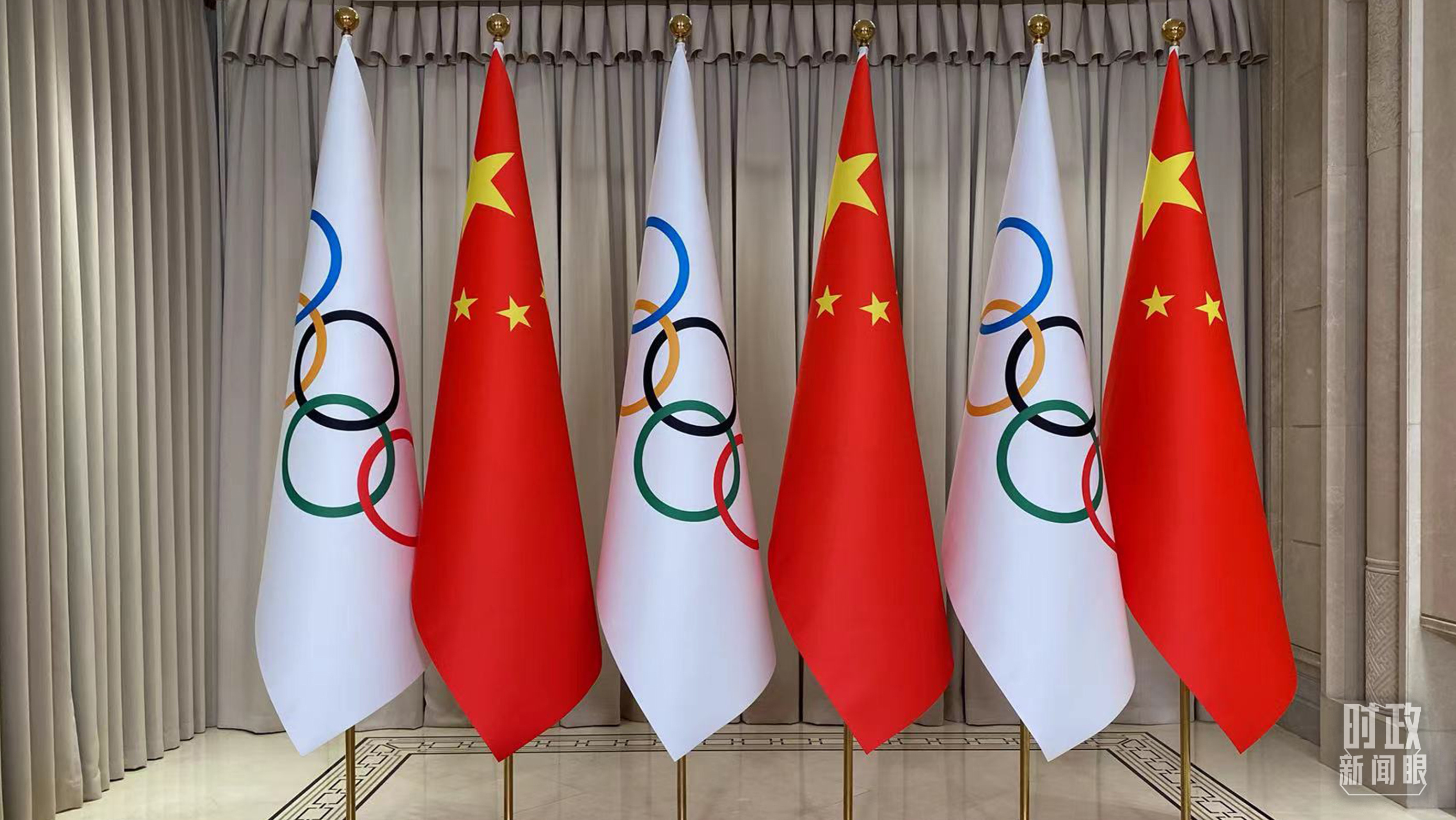 △會見現(xiàn)場擺放的中國國旗和奧林匹克會旗。(總臺央視記者李增仁拍攝)