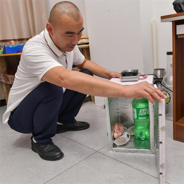 只有初中文憑的楊波就開始學(xué)習(xí)冰箱知識,了解冰箱原理結(jié)構(gòu):為什么會制冷還能調(diào)節(jié)溫度?等等,做到了了然于胸,又購買了冷卻片、制冷片、散熱片、風(fēng)扇、溫度計、封條等必備用料,自己又在工地找到了廢棄的塑膠板,在家具店里找來隔熱錫紙,經(jīng)過一番折騰,一臺高60 厘米、寬40厘米、厚40厘米的手工小冰箱做成功了。使用2個月來,最低溫度可達2攝氏度。效果非常好!