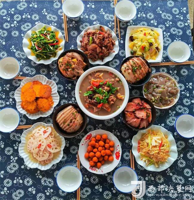 人家過事、過節(jié)、待客,更加隆重、有儀式感,必做“漫川八大件”招待。先上4碟小菜和“頂頭盤子”,叫等客菜,讓先到的客人吃著等人,不寂寞。